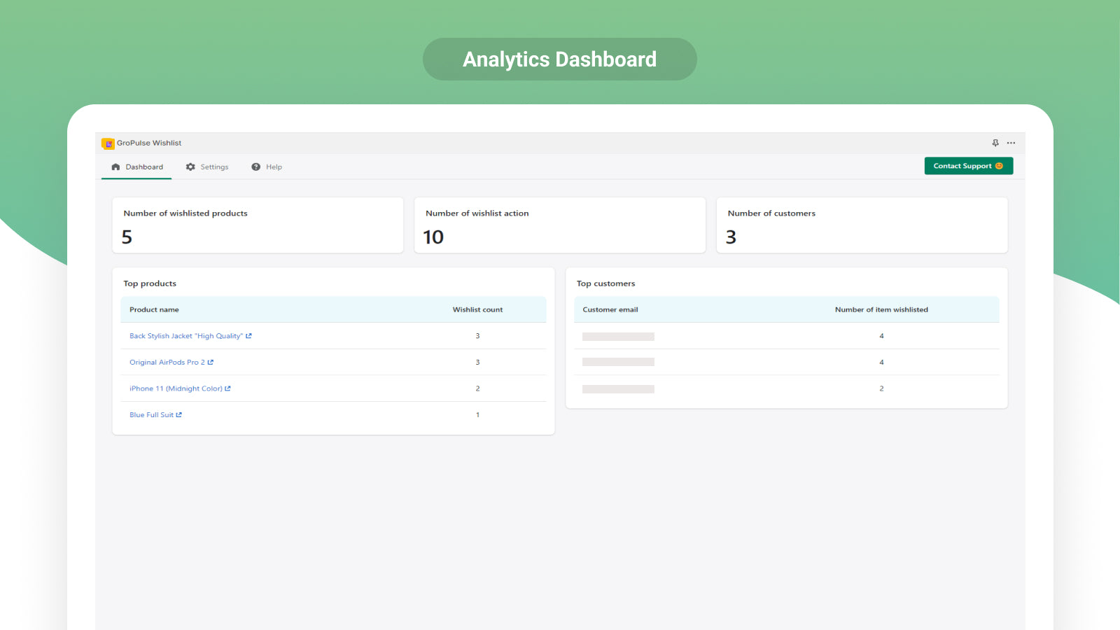 GroPulse Wishlist enhances your customer's shopping journey with a seamless, customizable, and manageable wishlist. Our wishlist button empowers users to curate their desired products, making it easy to purchase at their convenience. Our app dashboard helps to drive more sales by showcasing total wishlist items, top customers, and top products to follow up with customers.