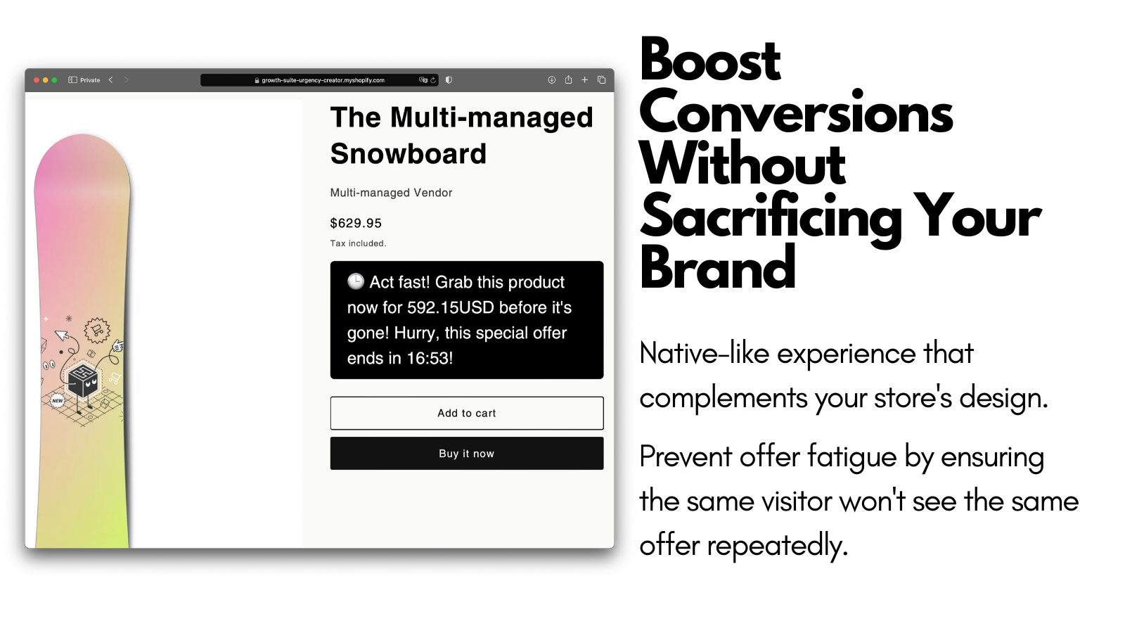 Growth Suite analyze visitor behavior in real-time to pinpoint the perfect moment to offer a personalized, time-limited discount, based on their buying intent. Our seamless integration adds timers to your store's header, product pages, and cart-drawer and cart page, creating a native-like experience that protects your brand. Each visitor gets a unique discount code that's automatically applied and deleted when the timer ends. No coding or theme changes required! Boost sales with Growth Suite.