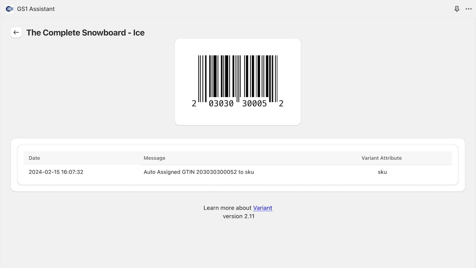 Assign UPC, EAN or GTIN barcode identifiers from your GS1 Company prefix directly to your product variants in Shopify. Enter you GS1 Company Prefix and let the GS1 Assistant do the rest. No GS1 tools required!