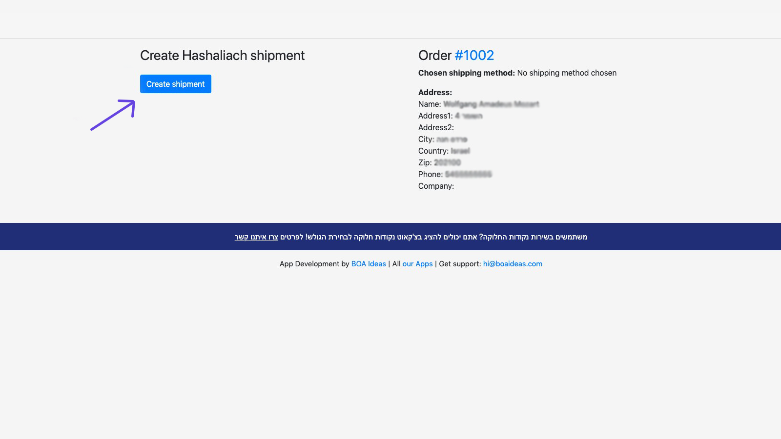 With Hashaliach Integration you will get a one-click system: Print labels, update tracking information, and notify customers with one click. The app is easily installed and ready to use, quickly integrates with Hashaliach systems for shipments in Israel. Receive a tracking number via the order screen that is linked to Hashaliach shipments system. Get automatic data input: with one click a new shipment is created with all the information