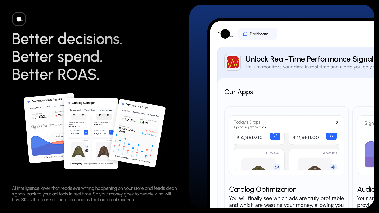 Stores run varied traffic and large product sets, but ad tools often act without full shop context Helium Ad Stack sits on your site, reads every visit and product in real time, and sends cleaner signals back to Meta & Google, so the ads stop chasing low-intent traffic and weak products. You can build intent-based audiences, focus ads on strong SKUs, and see which touchpoints tend to appear before a sale. Built for D2C brands fighting rising CAC. Setup does not need code changes.