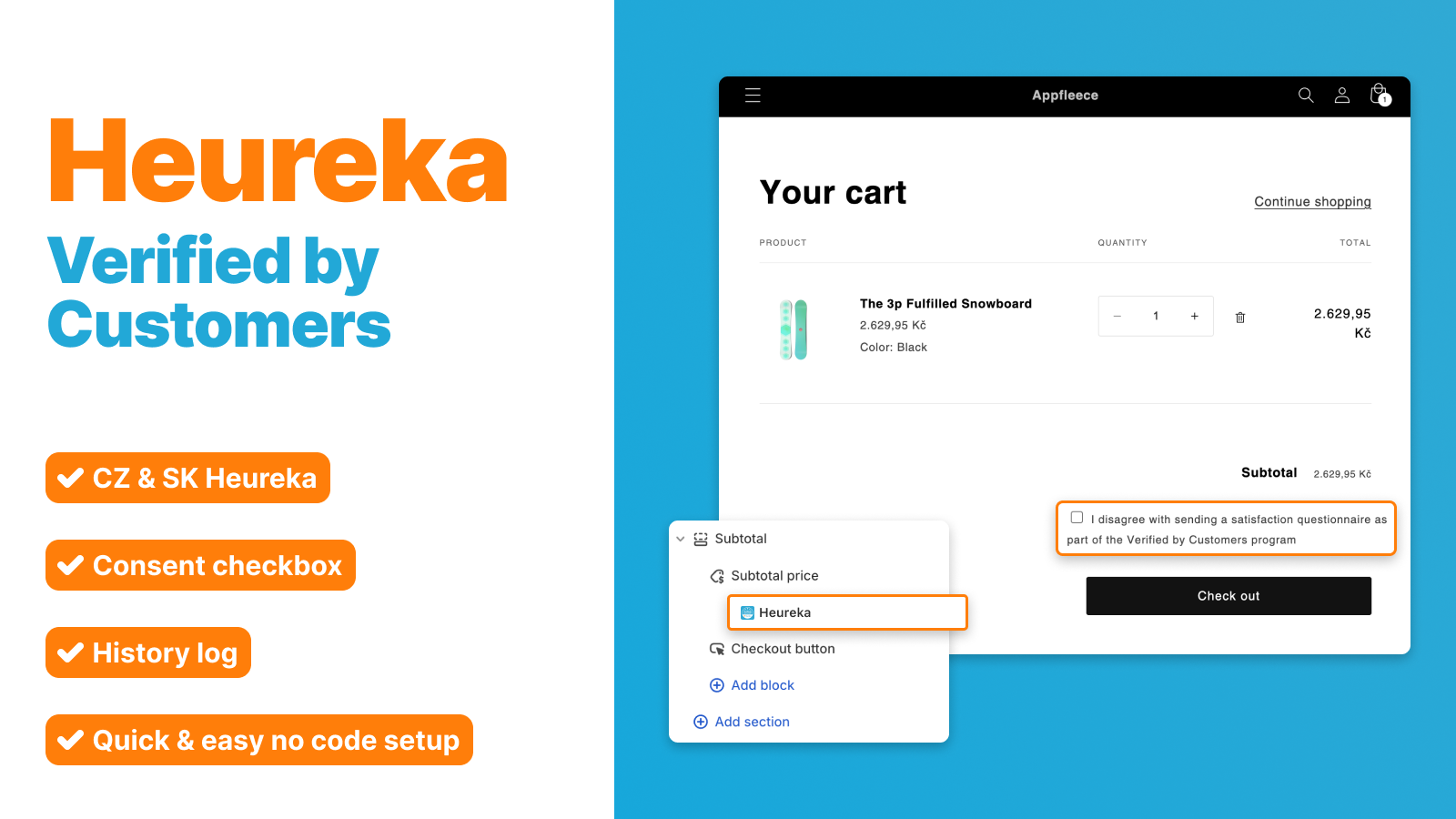 Improve the credibility of your store with the Heureka Verified by Customers application. After registering on the Czech or Slovak Overeno zakazniky portal and entering your API key, you can use our application to add a consent button for sending questionnaires in the cart or checkout. After a purchase and the customer’s consent, the application shares their email with Heureka, which sends them a questionnaire. You can then present the obtained reviews and certificate on your website.