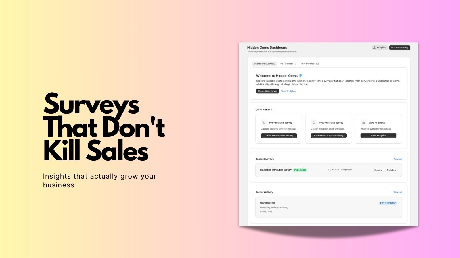 Hidden Gems solves the challenge of collecting meaningful customer data without disrupting the shopping experience. Beautiful, powerful surveys that customers will enjoy. Unlike traditional surveys that overwhelm customers, our Question Flow approach presents one question at a time at optimal moments - before purchase on site and after purchase on Thank You and Order Status pages.