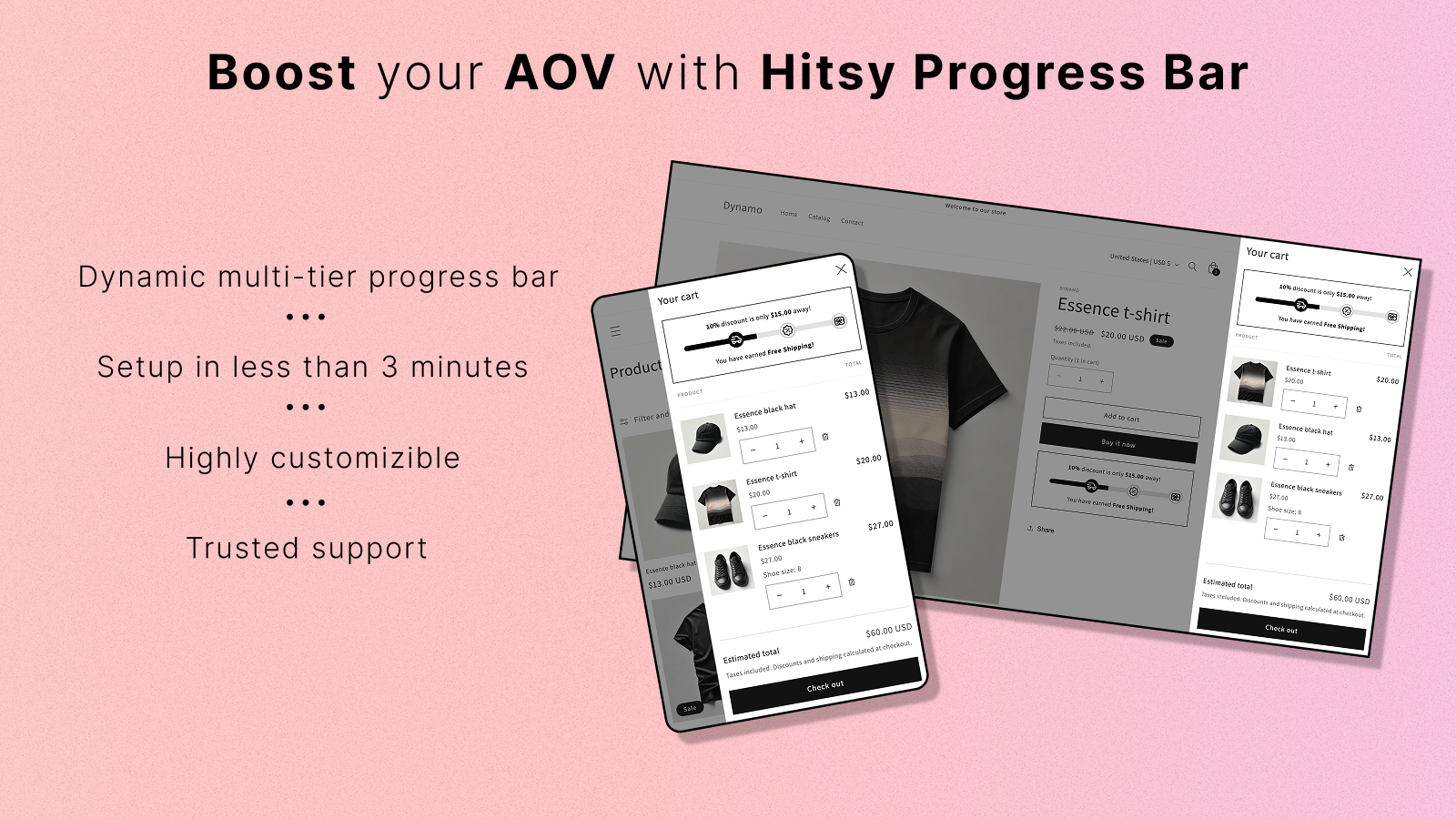 Dynamic, multi-tier progress bar that visualises your Free shipping, Order discounts and Free gifts