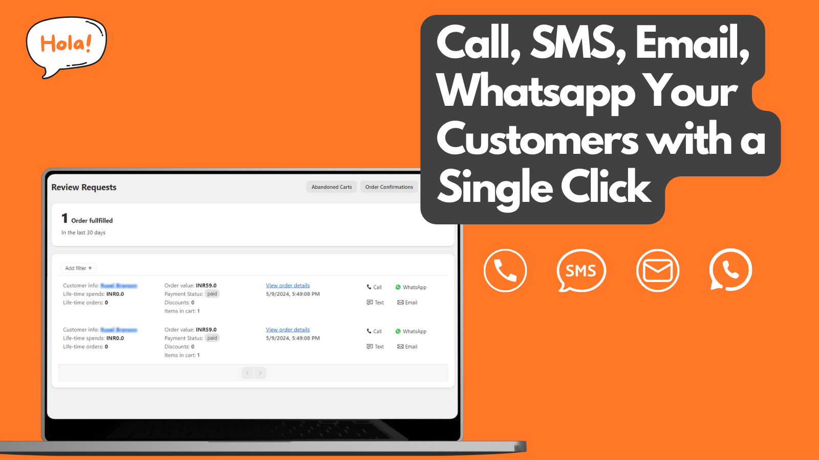 Order Confirmation, Cart Recovery, Review Requests, and more via call, email, SMS & WhatsApp.
