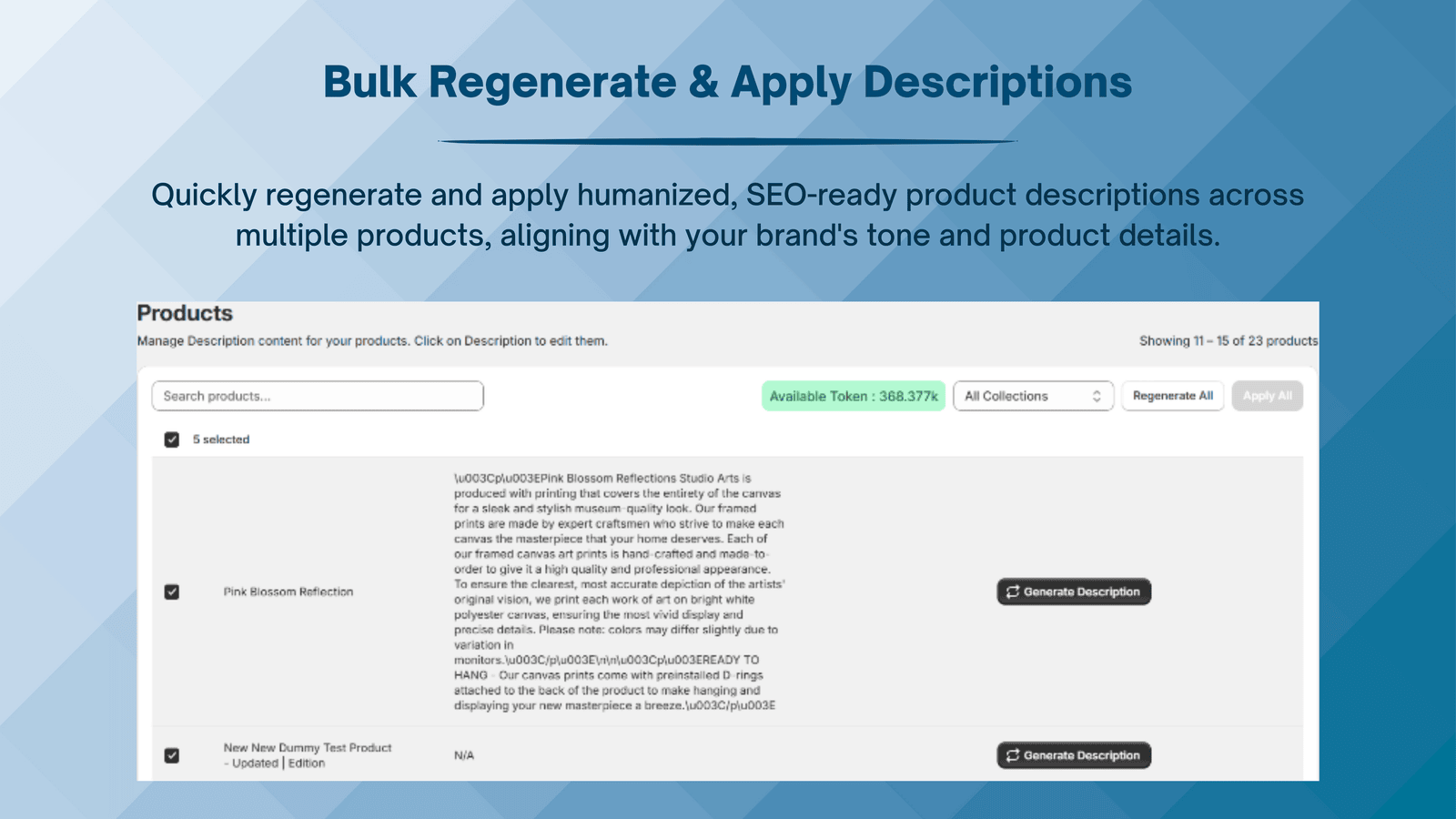 This app helps Shopify merchants enhance their product pages with high-quality, human-like descriptions generated using AI. It’s designed to reflect each store’s unique brand voice, improve SEO, and save time by enabling bulk content generation and direct application to products.