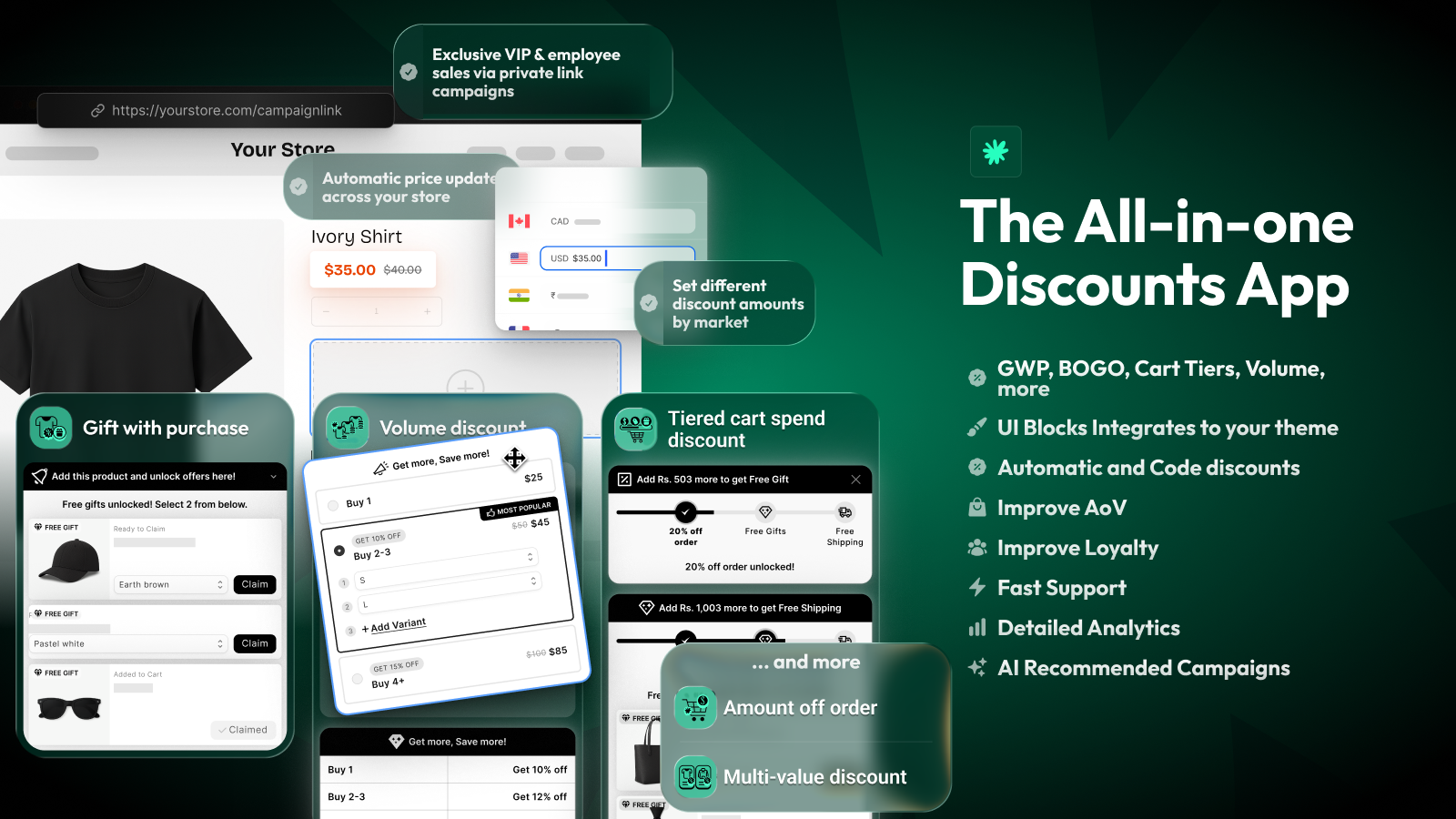Boost sales with multi-market all-in-one discounts, strike-through pricing, and visual widgets.