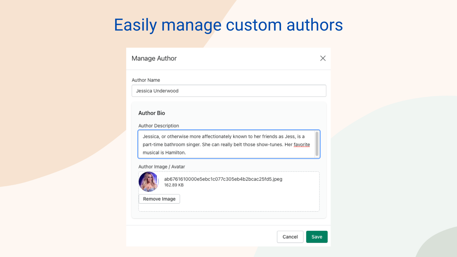 Easily add and display your own custom writers on blog articles.