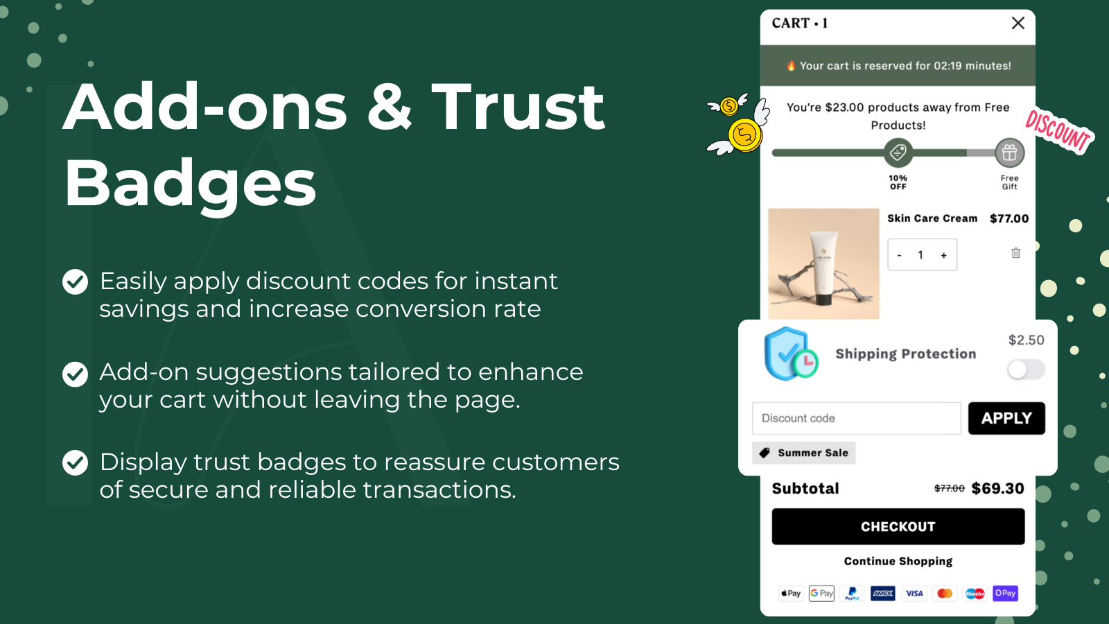 Boost conversion rate & average order value with advanced upsell, cross-sell & add-on features with Cart drawer Cart upsell. Cart drawer is designed to seamlessly match the look and feel of your site with features like sticky cart, multi-progress rewards bar with Geo-Targeting option, discounts, auto add to cart any free gifts or products / BOGO offers & trust badge. You can show split payments, trust badges, countdown timers, multi-language support, multi templates styles for your cart drawer.