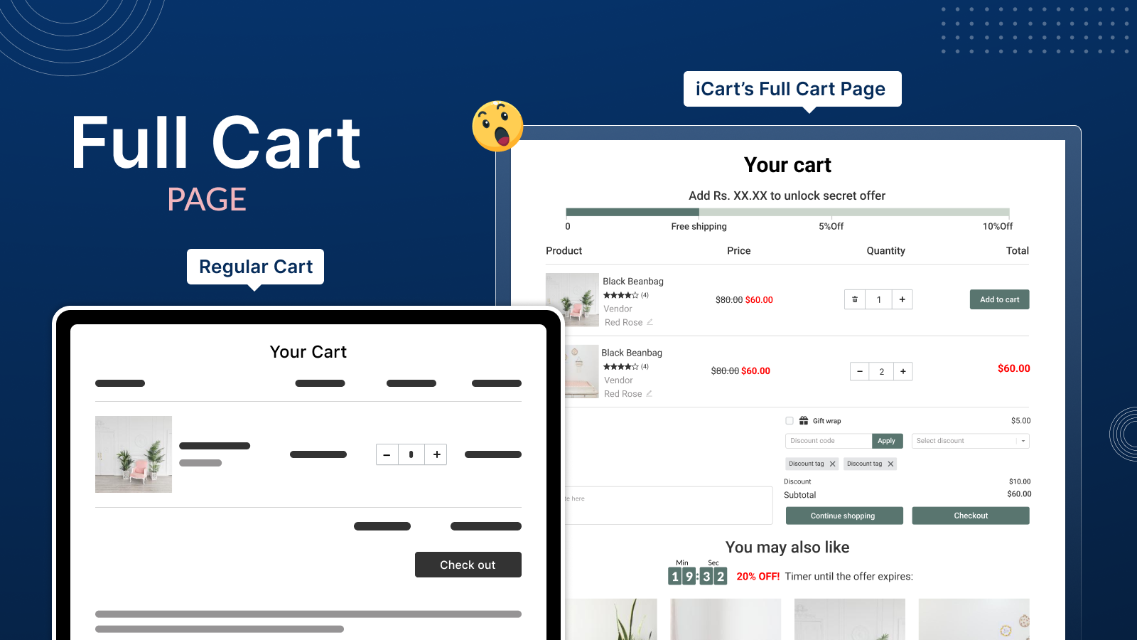 iCart’s in cart upsell & cross-sell features helps to increase AOV and boost conversions in your store. Reduce cart abandonment by adding a sticky slide cart and drive sales by offering product bundle, discounts, product upsell & cross-sell offers. You can add cart drawer, cart popup or cart page and level up cart by customizing them based on your need to suit your store’s theme and aesthetic. Take your upselling and cross-selling game to new heights with iCart Cart Drawer Cart Upsell.