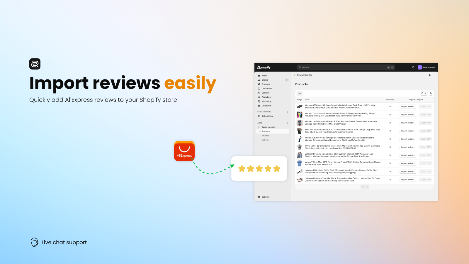 Ryviu AliExpress Reviews Importer allows you to import Aliexpress reviews with one click and export.