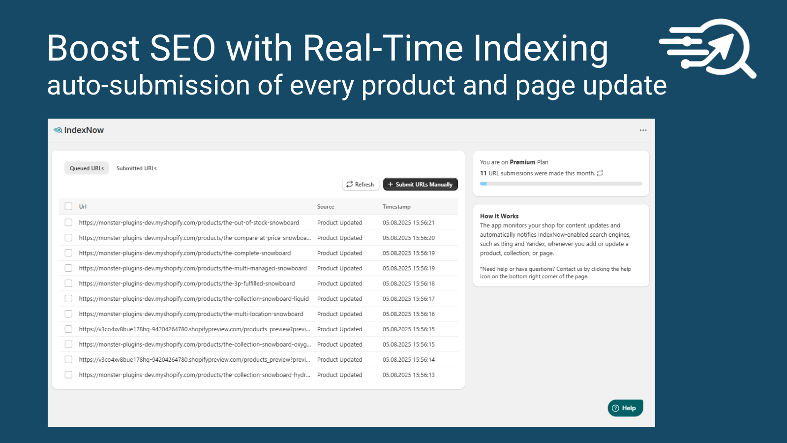IndexNow makes sure your Shopify store stays visible and competitive by automatically notifying search engines like Bing, Yandex whenever you add or update a product, collection, or page. Built to leverage the official IndexNow protocol, our app ensures faster crawling, fresher search results, and improved visibility across both traditional search and AI-driven platforms — including tools like ChatGPT, which rely on Bing's index for up-to-date content.