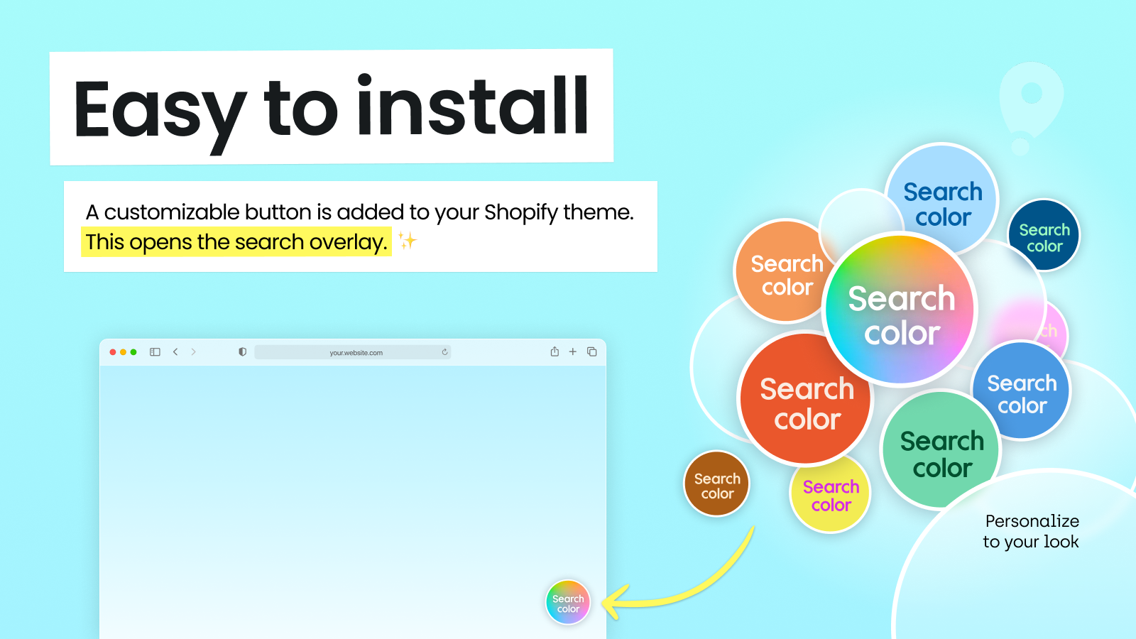 Infinite Color Search instantly locates the perfect color match within your website and seamlessly ventures into harmonious colors. Our color search overlay is opened through a customizable “Search color” widget in the corner of your website. Clicking a search result opens your product page, where shoppers can complete the purchase. Say goodbye to text-based color filters, and hello to our innovative color search experience!