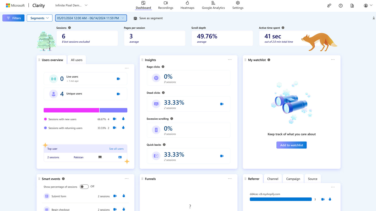 Infinite Microsoft Clarity is a web analytics tool that helps you see what’s working on your site and where people get stuck. With features such as session recordings and heatmaps, you’ll gain a deeper understanding of how your users interact with your site, and get clear insights on how to improve your design to grow revenue and increase user retention.Track behavior data from traffic originating from Microsoft Shopping ads and monitor Bing UET tags for comprehensive behavior analytics.