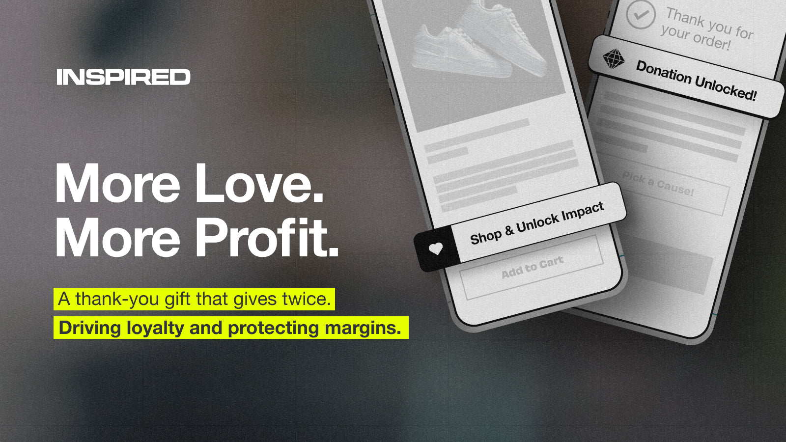 Turn every purchase into a thank-you gift—funded by major donors and The Inspired Foundation. With Inspired, each order unlocks a free 5% donation to a cause your customer cares about—no donation cost to you or your customers. Brands use Inspired to reduce discounting, grow sales, drive repeat purchases, and build loyalty—while featuring timely, relevant causes that reflect customer values, brand voice, or cultural moments.