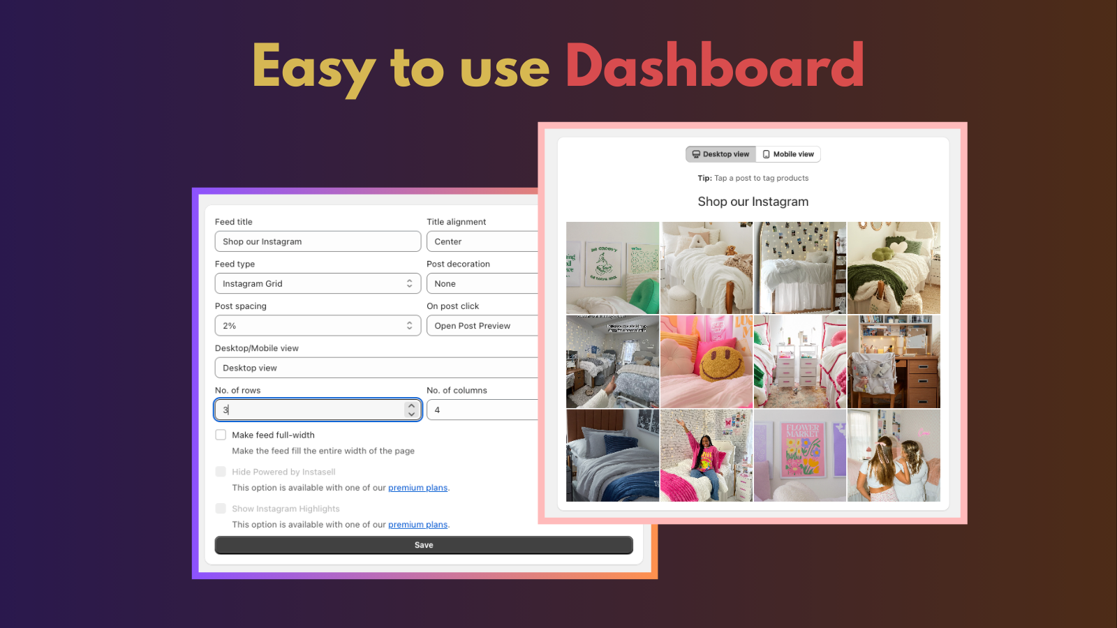 Instafeed app helps display your Instagram feed elegantly on your website. You can turn your store visitors into customers with Insta feed. Showcasing your Instagram gallery can give Ultimate Social Proof on your website to your visitors Set it up in less than 60 seconds in two clicks. You can hide posts, rearrange according to popularity and use our custom prompts to design the feed as you'd want with AI. It works like magic 🦄 Instagram lookbooks are the way to go to earn trust for sales.
