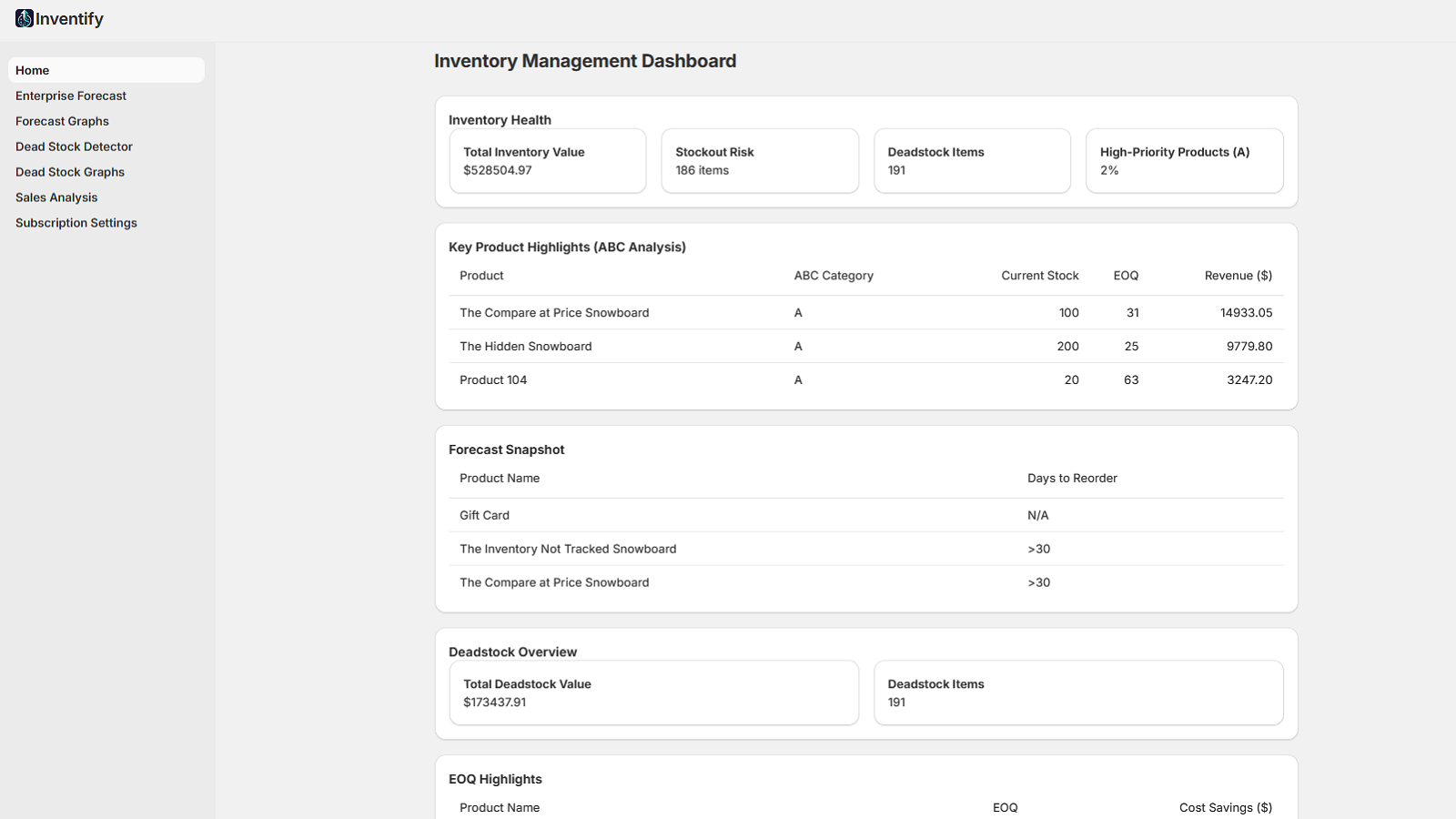 Inventify app. Forecast demand, graphs, detect dead stock, analyze sales. Optimize inventory!