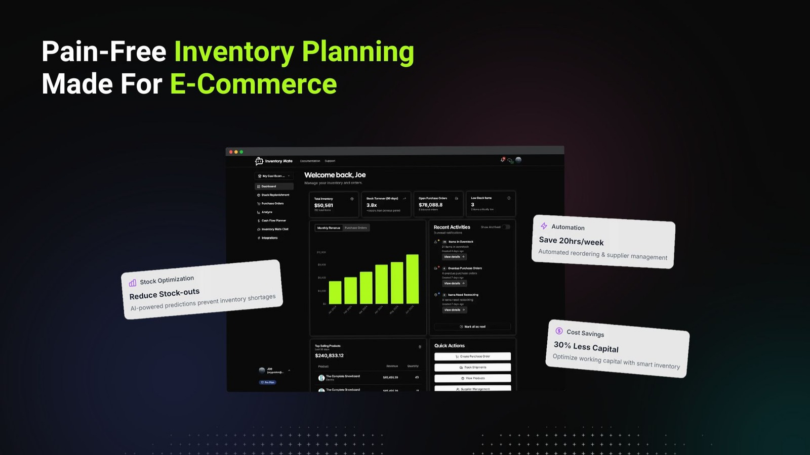 Ditch the spreadsheets and upgrade to Inventory Mate — your new AI powered assistant to automate purchase orders and simplify stock replenishment. Never Run Out of Stock Never disappoint customers with out-of-stock messages again. Get intelligent alerts right before you need to reorder, keeping your bestsellers available while maintaining optimal inventory levels. Automated Supplier Interaction Stop juggling spreadsheets and emails. One-click POs, track shipments, and supplier update portal.