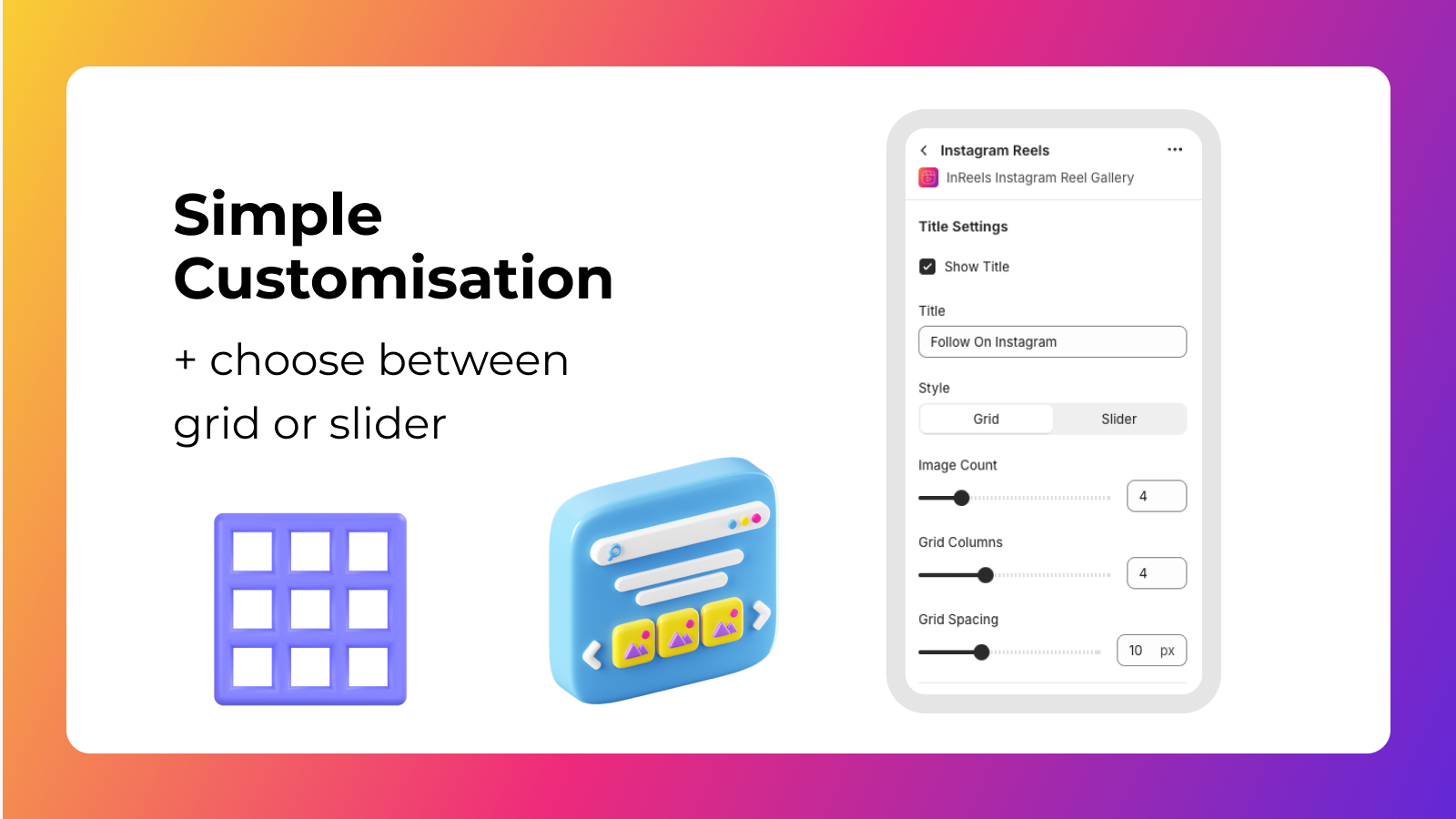 Add your scrollable Instagram Reels to your website with TikTok shop like Shoppable Videos. Import Instagram Reel with one click and link products to them. Shoppable Videos with Instagram Reels are a great way to showcase your product/brand videos from Instagram and sell your products through videos. We also allow customization of the widget look and feel, with great instant support from our team. You can select the number of posts and show it as a grid or slider.