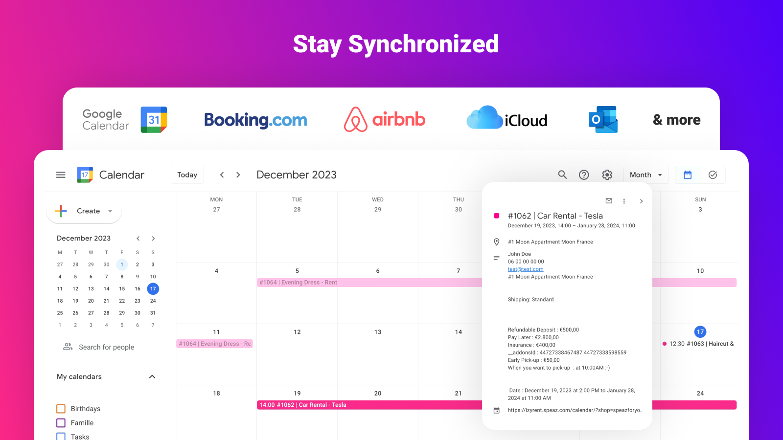 Essential for every bookings, rentals, events, services, & appointments business. One click and you can now take hotel bookings, rent equipment & clothings, sell courses & a lot more. You dont have to set each availability date. It's fully dynamic. You can track all your current bookings directly from the app or on your favorite calendar! Speed and ergonomy is important, that's why IzyRent use a fast and lightweight calendar for best performance & user-experience.