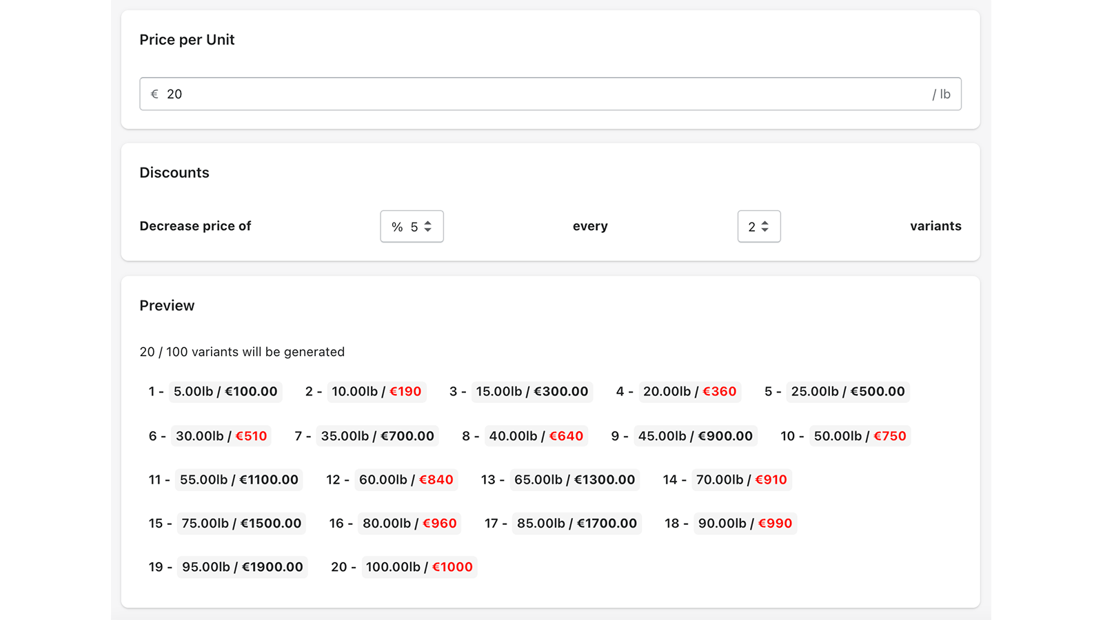 Essential for greengrocers, grocery stores, butchers, parquet floors & much more. No need to generate all the variations, our app does it for you. You can now sell products with decimal quantity! It is mandatory when you sell fruits, vegetables, meats, drinks, or even cut-to-size fabrics. Everything is automated. You can link and unlink products with just one click. HUGE TIME-SAVING! Let's say you want to link some products with these parameters: * Unit: g * Price: 30