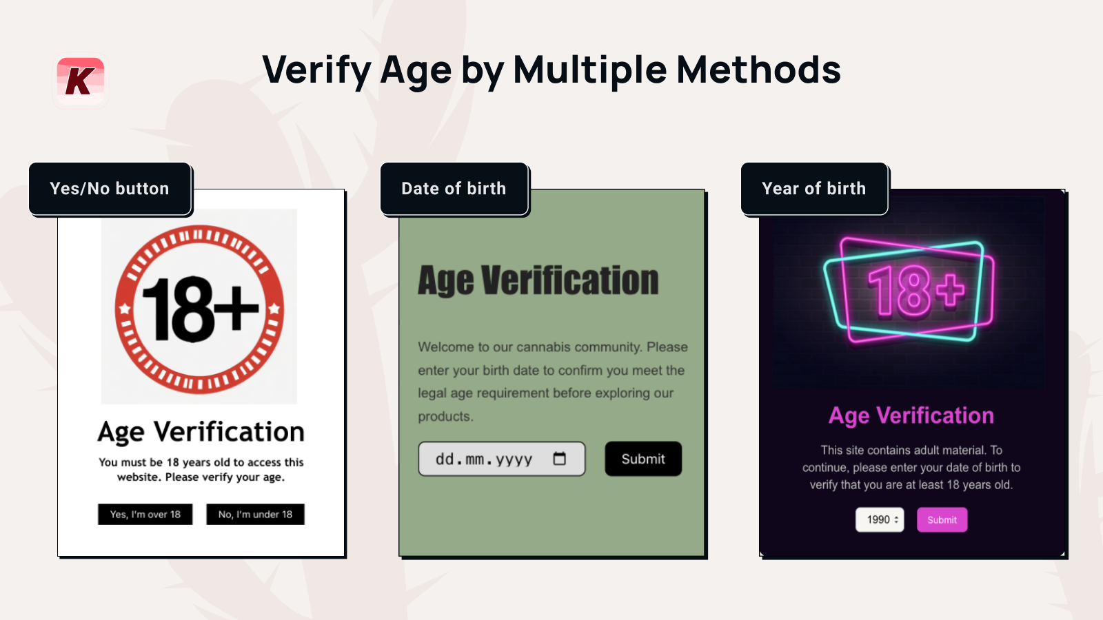 Easily integrate age verification into your online store with our Age Verification App! Designed to protect minors from accessing inappropriate content, you can set a minimum age limit of 18+ or 21+ to ensure legal compliance and protection. Enhance your business's compliance effortlessly with our Age Verification Popup App. Boost legal adherence and safeguard your website by verifying age through simple yes/no buttons, date of birth, or birth year entry.