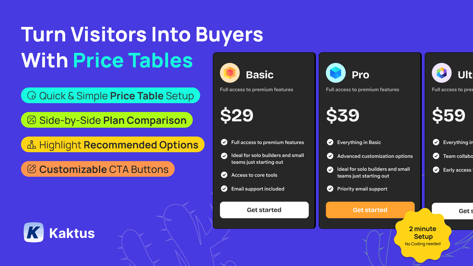 Create beautiful pricing tables to showcase product plans, tiers, or service packages.