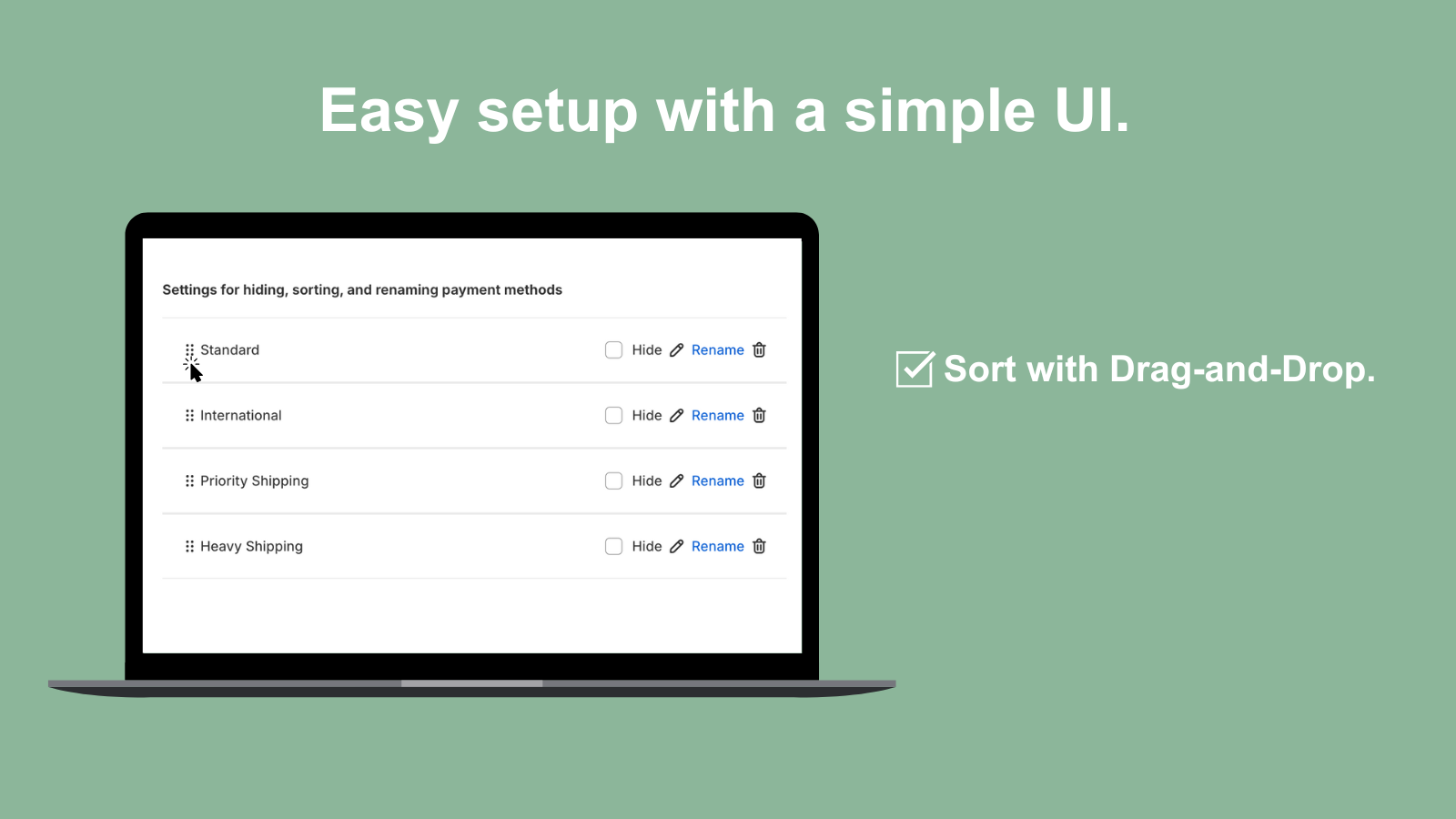 Customize your checkout by hiding, sorting, and renaming shipping options.