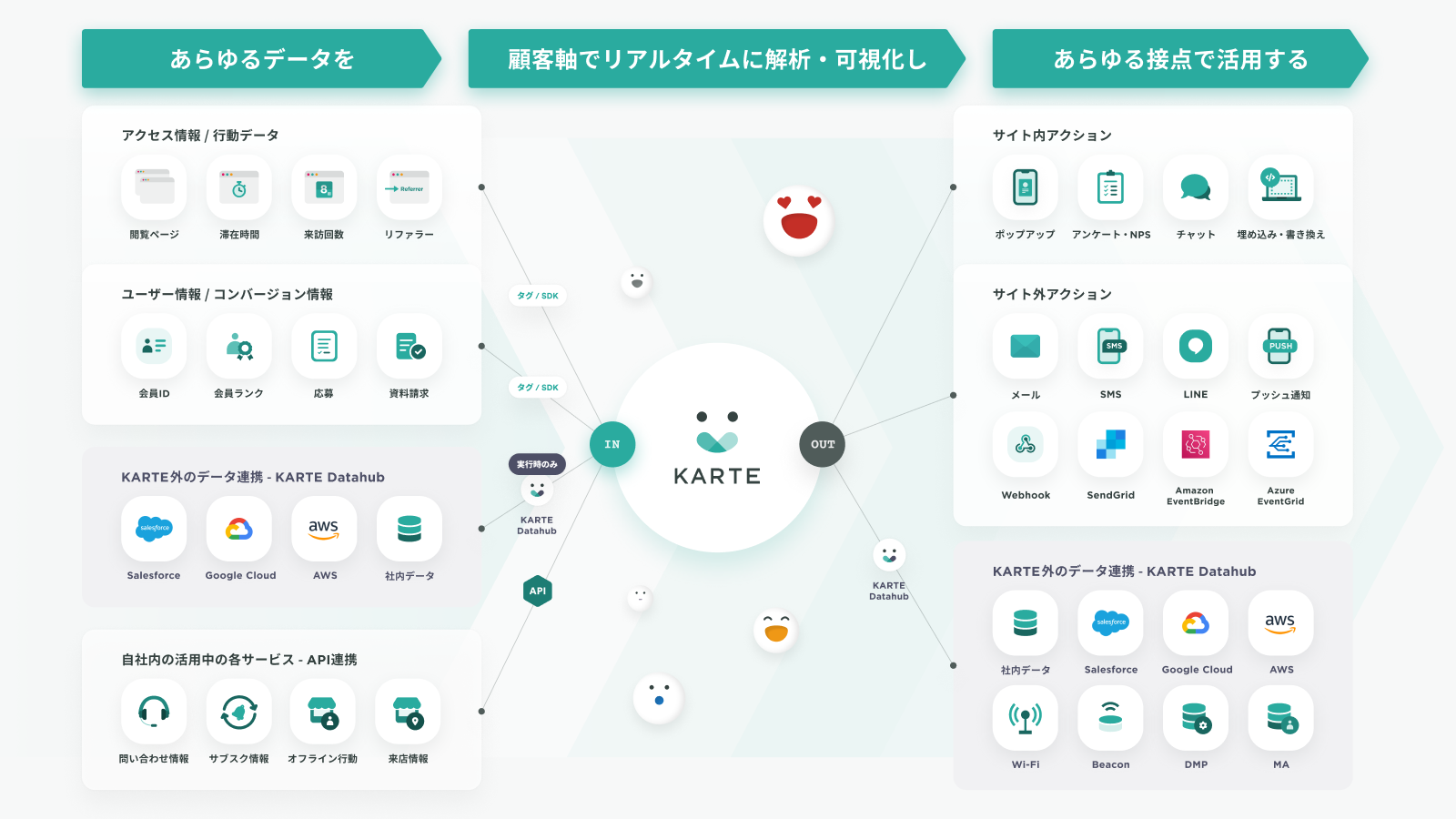 KARTEは、ウェブサイトを利用する顧客の行動をリアルタイムに解析して一人ひとり可視化し、その人にあわせた自由なコミュニケーションを実現するCXプラットフォームです。KARTEを使えば、カスタマーデータの解析を中心とする高度な顧客分析、それに応じたアクションやコンテンツ配信の最適化をオン・オフ問わずあらゆる顧客接点で実現し、サイトの購買体験の改善とLTV向上に貢献します。 KARTEのShopifyアプリを使えば、今すぐ簡単にKARTEの活用を始めることができます。「KARTE」を中心とした当社プロダクトをご利用いただくにはタグ実装が必要ですが、アプリを使えば開発不要でKARTEのご利用を開始できます。