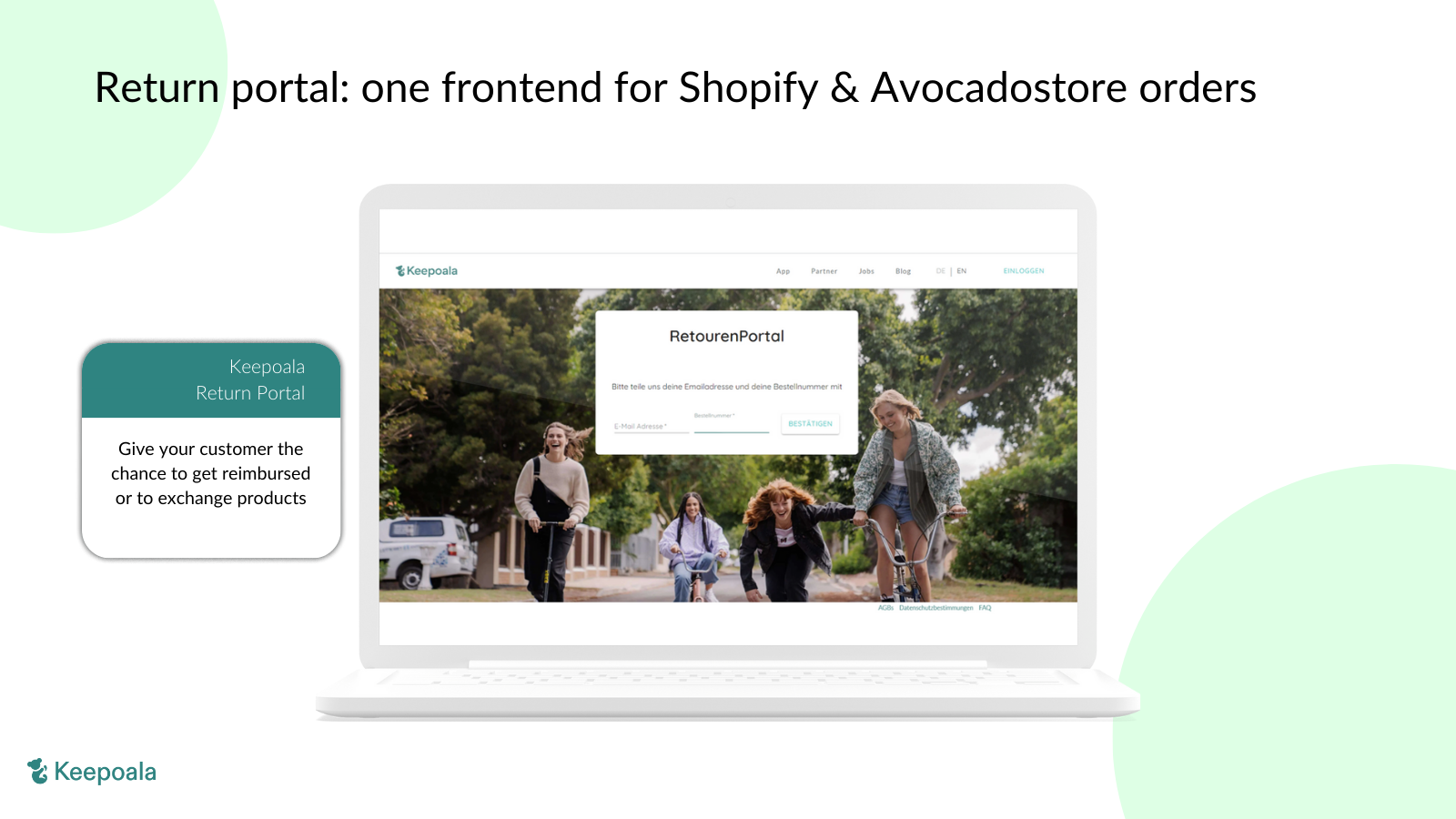 As a multi-brand loyalty program, we incentivize customers to avoid returns by granting points for not sending back online orders. Collected points are redeemed for vouchers in your shop, used by shoppers that keep 9/10 orders, opening up a new customer acquisition channel & increasing retention as well. This is done with the help of a standalone Keepoala App, your shop being connected via Shopify. Handle remaining returns within our whitelabel return portal, being part of the same Shopify app.