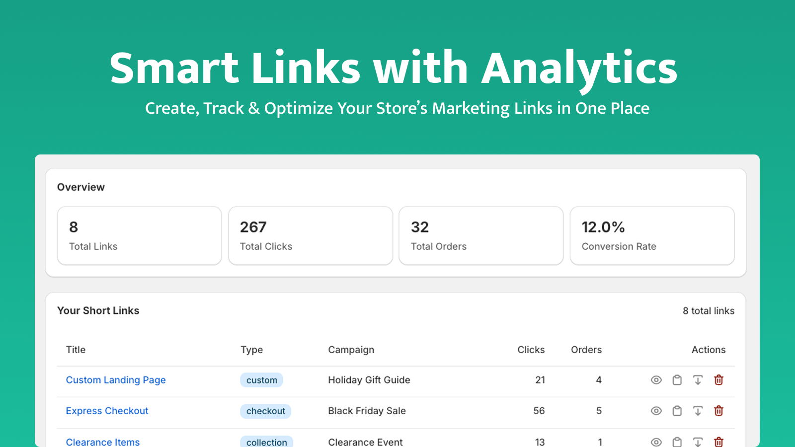 Create short links and QR codes for your products, checkouts, or any page in your store. Track where your traffic is coming from, see which links drive orders, and get clear insights on what’s working. Group links into campaigns, view clicks and sales in real-time, and make smarter marketing decisions—all without leaving your Shopify admin.