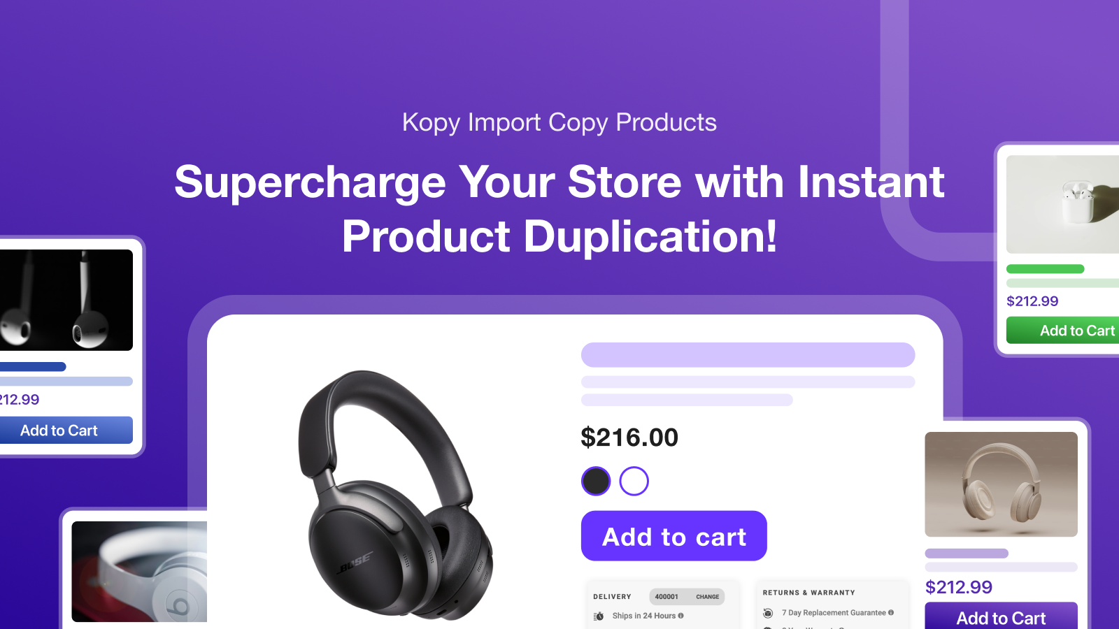 Kopy-er Import & Copy Products is the ultimate product importer for Shopify merchants, making it easy to duplicate and copy products, copy collections, and clone entire store setups in one click. Perfect for dropshipping, bulk imports, or product imports, it saves you hours. Alternative to Kopy, Poky, Copify Key features include: * Full-store backups and one-click duplication * Copy products, collections, pages, and blogs * Bulk import or clone individual items Copy Products