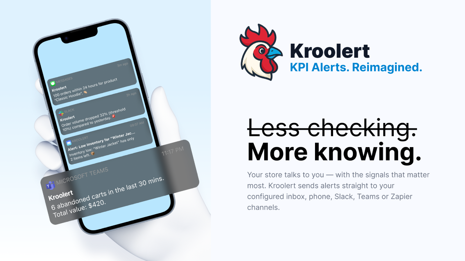 Kroolert turns your store’s KPIs into a real-time monitoring and alerting system. Track metrics like revenue, orders, inventory, abandoned carts, and more - without checking dashboards. Set flexible thresholds to get notified instantly when something important happens. Alerts are delivered via email, SMS, Slack, Microsoft Teams, or thousands of tools using Zapier. Kroolert adds lightweight observability to your store so you can act fast and stay in control.