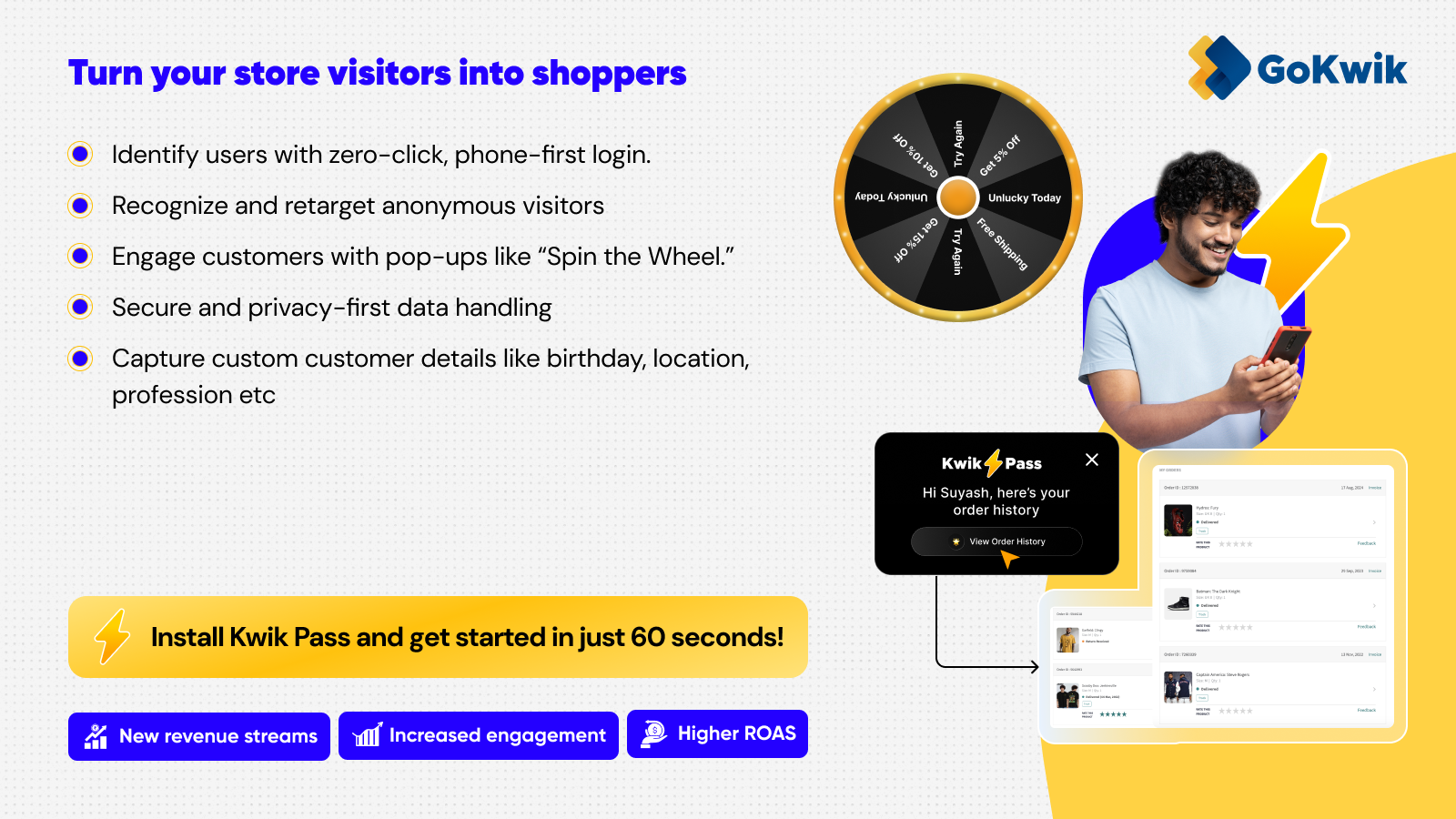 Make logging in effortless with phone-first, SSO-powered access. Instantly identify users as they land on your store, ensuring a seamless and secure shopping experience. Engage visitors with interactive pop-ups like “Spin the Wheel” to capture attention and incentivize actions. Collect customer data at every touchpoint, from browsing to checkout. Rest assured, all data is handled securely, complying with global privacy standards, enabling you to build trust, drive sales, and grow loyalty.