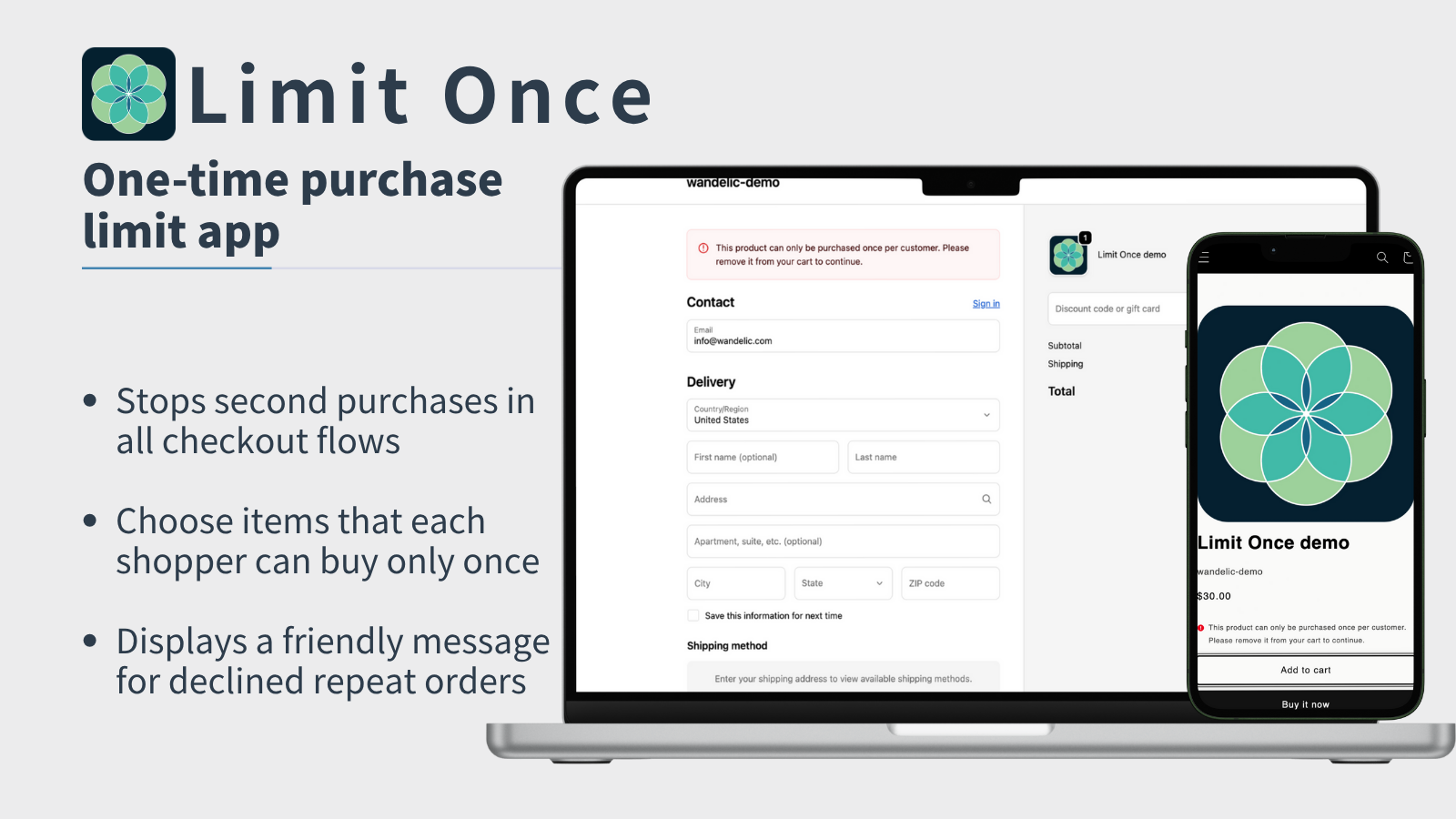 Limit Once prevents second-time purchases of chosen products. Select the items to cap, and the app enforces a “one per customer” rule during checkout—including express options—so repeat attempts are declined with a clear message. Setup takes minutes in Shopify, and you can turn the rule on or off per product whenever you need.