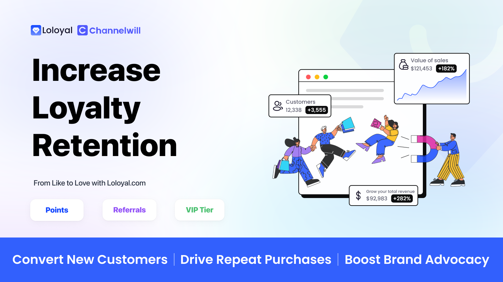 Loloyal, LL means from Like to Love (Increase customer loyalty). Powered by Channelwill.