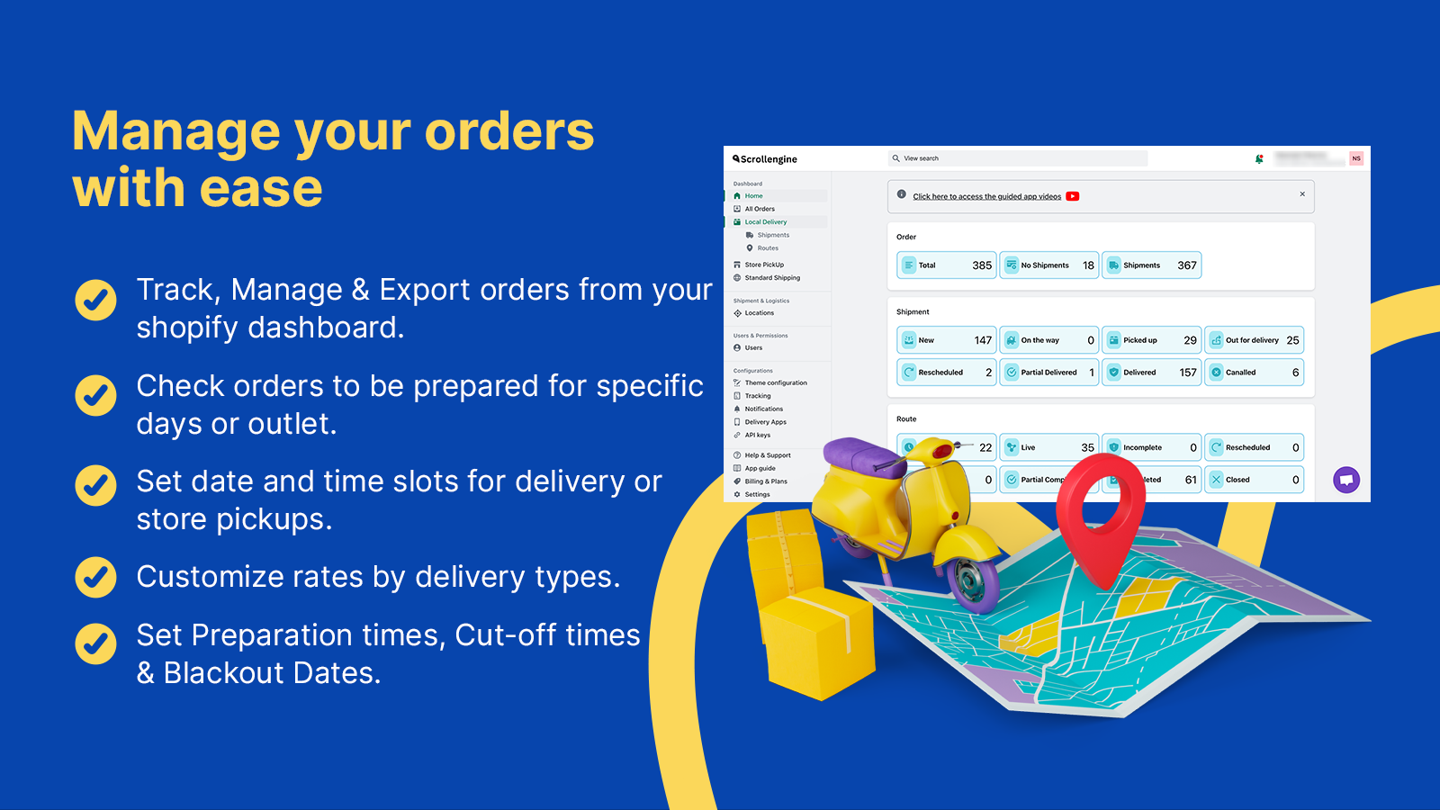 Our local delivery app offers end-to-end solutions for in-store pickups and local deliveries for online and brick-and-mortar merchants. It has all the features you need including route optimization, delivery assignment and scheduling, driver management, order tracking, and real-time delivery notifications—all accessible from your Shopify dashboard and POS system. Increase foot traffic to your stores, reduce shipping costs, and improve online conversion rates while boosting your revenue.