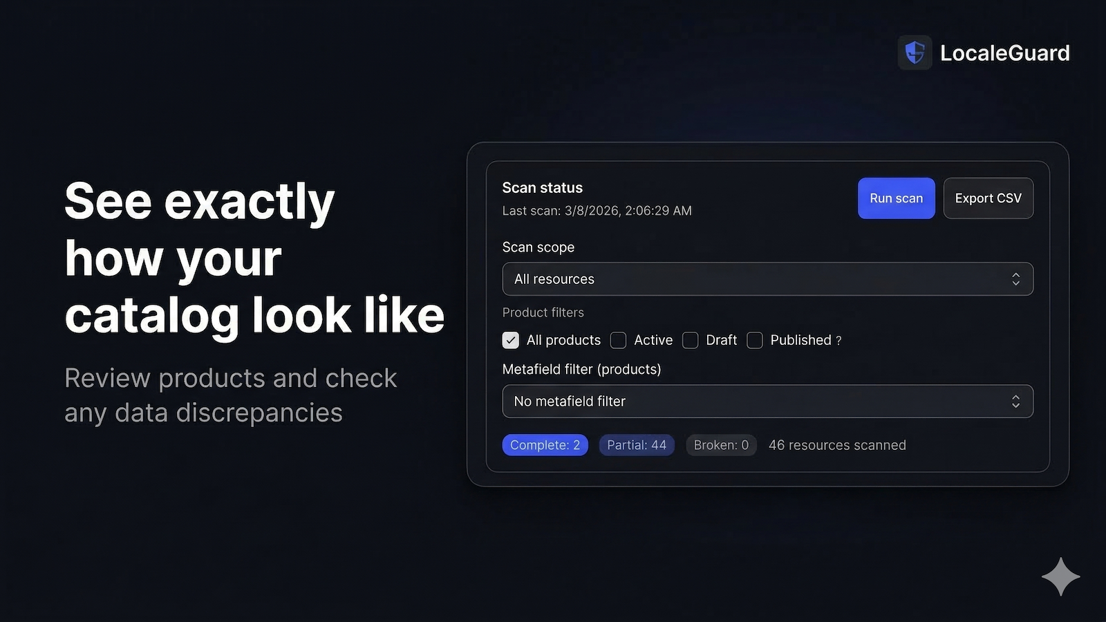 LocaleGuard scans your store to find missing translations, incomplete SEO fields, and broken locales across products, collections, pages, and metafields. Get a clear status per locale, drill into exact issues, and export reports for audits or launches. Run scans anytime to catch localization problems before they impact customers or search visibility.