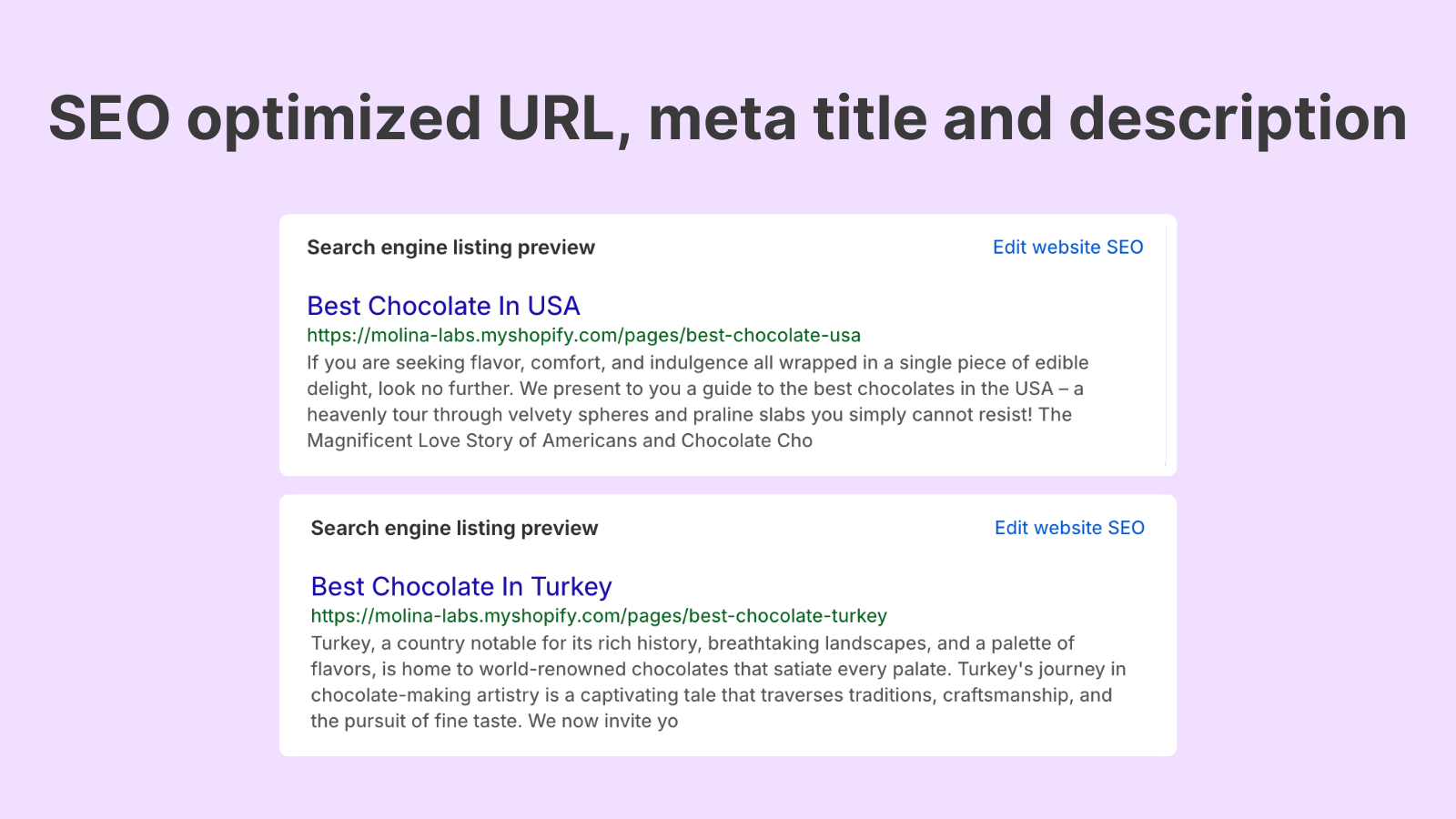 Help your local SEO strategy with our ChatGPT-powered AI landing page generator. Designed specifically for merchants looking to improve local SEO ranking. We help you generate highly targeted landing pages based on specific locations and keywords. Local search optimization is crucial for businesses looking to attract customers in their area. Our app ensures that your store appears prominently in local search results, making it easier for potential customers to find you.