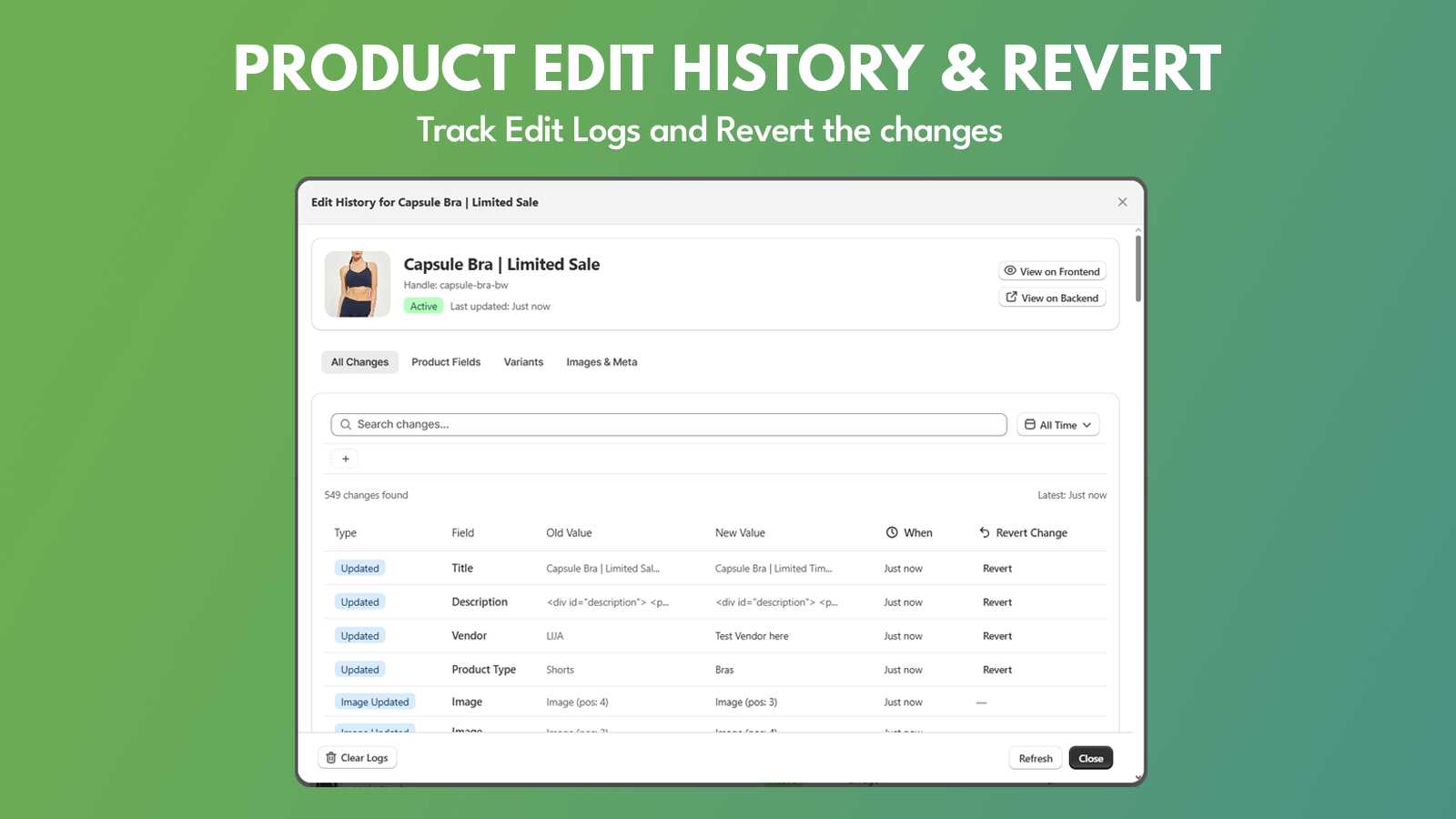 Loggr gives merchants a complete product edit history, tracking every change to titles, descriptions, images, variants, pricing, tags, and metafields. Stay in control with real-time change logs, advanced filters, and detailed views of old vs. new values. Easily revert products to a previous state with one click, preventing costly mistakes and saving time. Loggr ensures accuracy, accountability, and peace of mind for every Shopify store.