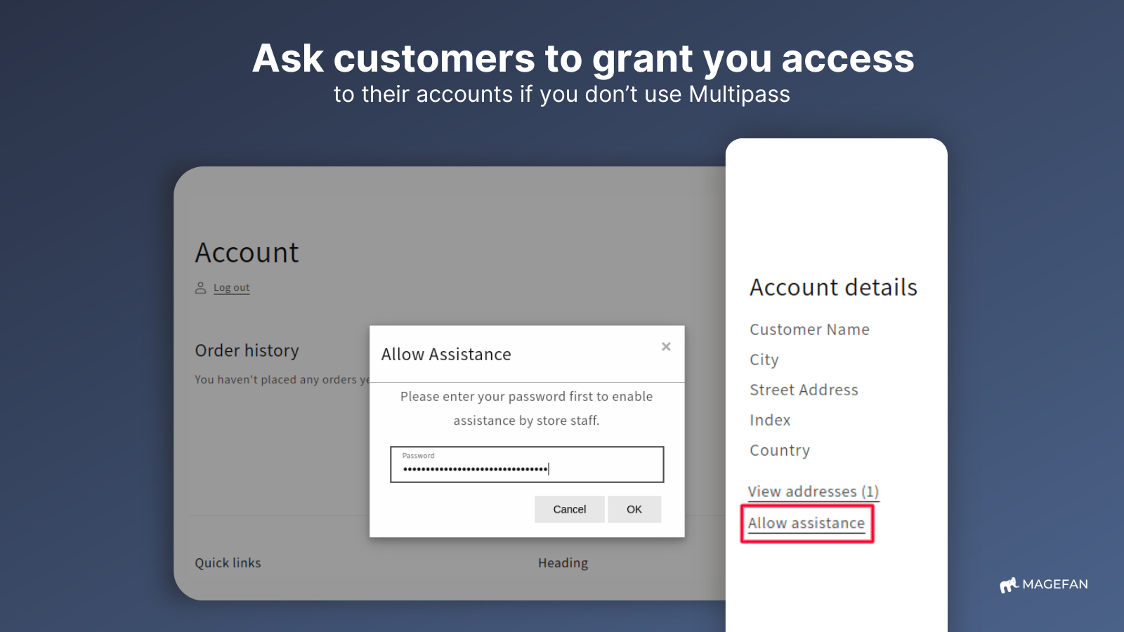 Optimize your customer support and deliver better and faster service with little effort. Log in as a customer directly from the admin panel and assist customers with various tasks. Place orders, prepare shopping carts, fill out order details, finish account set-up, fix account-related issues and more. Note: the app doesn’t require you to use Shopify Plus, it just offers different options to login with and without the Multipass technology available in the Plus plan.