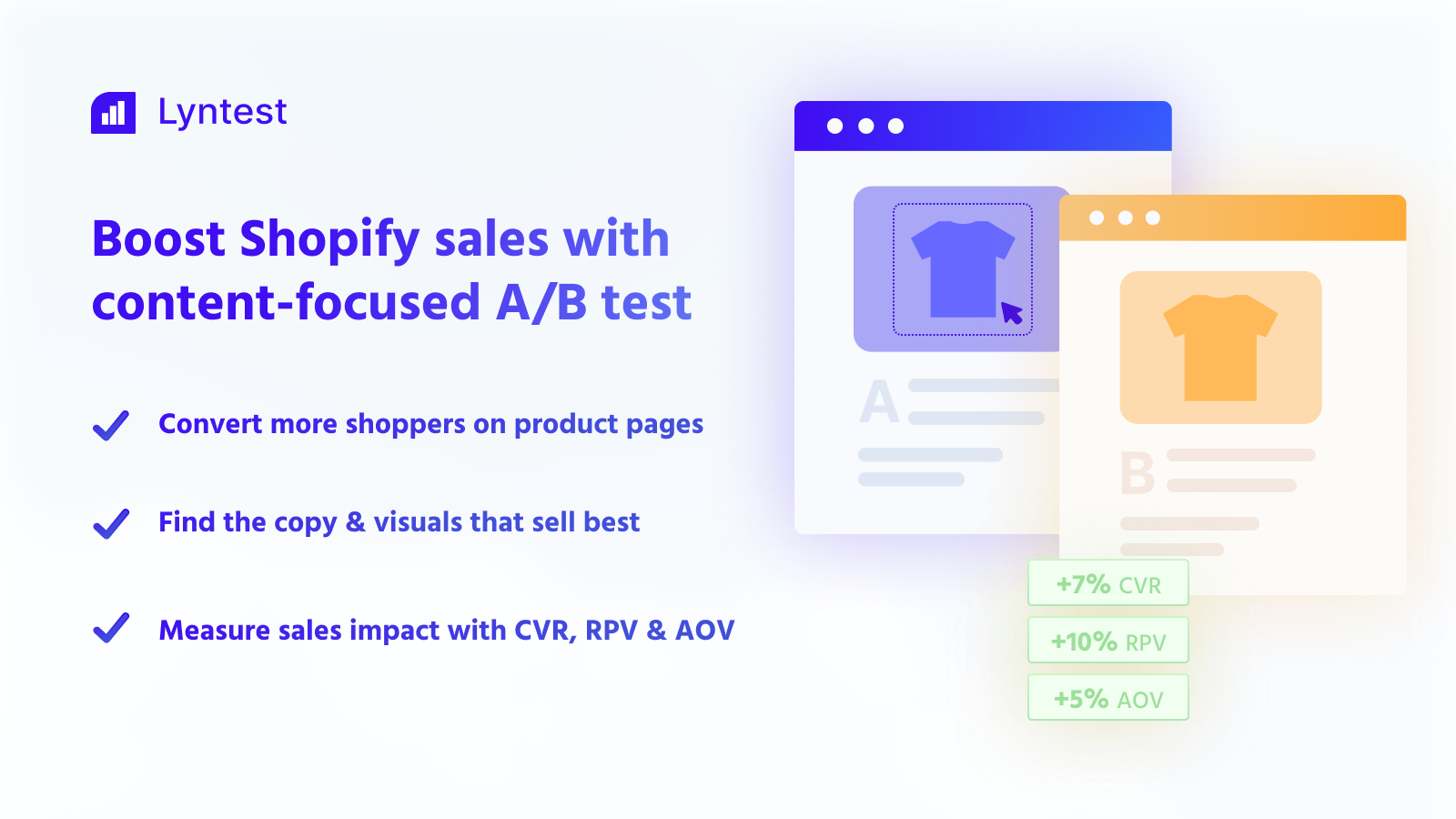 Run A/B tests on your Shopify store, no coding required. With Lyntest, you can easily test different versions of your content to see what truly connects with your customers. Change text, swap images, or adjust layouts directly on your page, all in a few clicks. Track live results and understand how each version performs, so you can make data-driven decisions that improve conversions. Built for Shopify merchants who want a simple way to optimize their store experience.