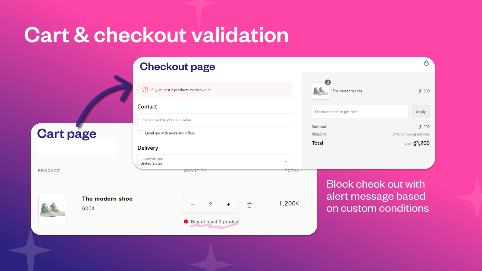 The custom rules builder allows you to set specific conditions for checkout. For example, you can control the number of items customers can buy, require certain customer or product combinations, restrict product availability to logged-in users, and implement checks based on product details, variant, collection and cart.