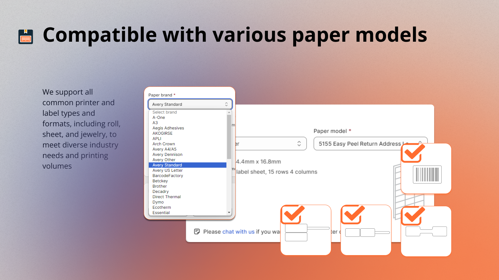 A comprehensive barcode generator and printer compatible with various printer and paper models.