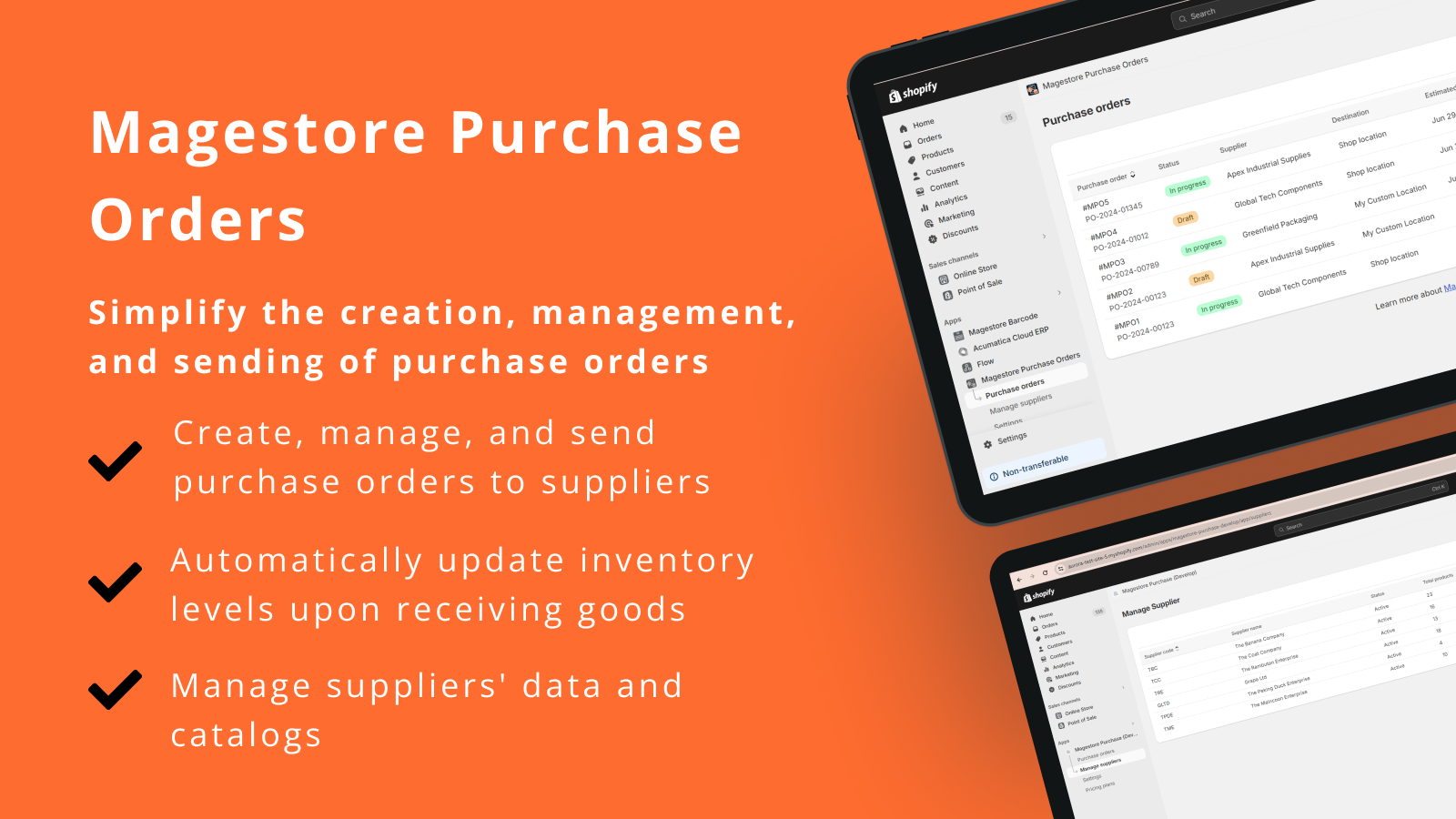 Magestore Purchase Orders simplifies your purchasing process by allowing you to create and send purchase orders to suppliers and monitor their status all in one place. Easily add products to purchase orders using barcodes, file uploads, or by searching your store’s inventory. Keep detailed supplier profiles with contact information, payment terms, invoices, and more for quick and easy reference.