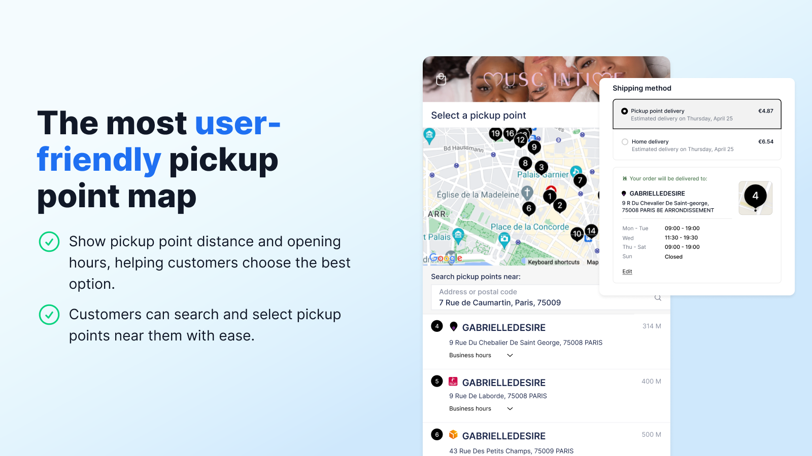 A map for selecting pickup points displayed in and after checkout, compatible with multiple carriers