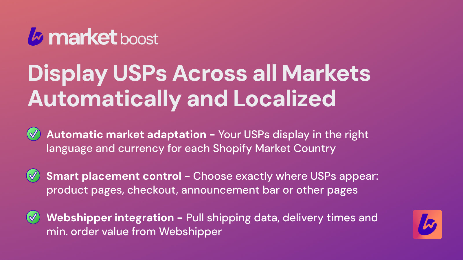 Market Boost displays your unique selling points across all Shopify Market countries with proper localization - supporting multi currency and translations. Show country-specific shipping rates, delivery times, and minimum order value in the correct language and currency. Control where country-specific USPs appear: product page, announcement bar, checkout. USPs can be displayed on checkout page for plus customers only. Our webshipper integration automatically fetches country shipping data.
