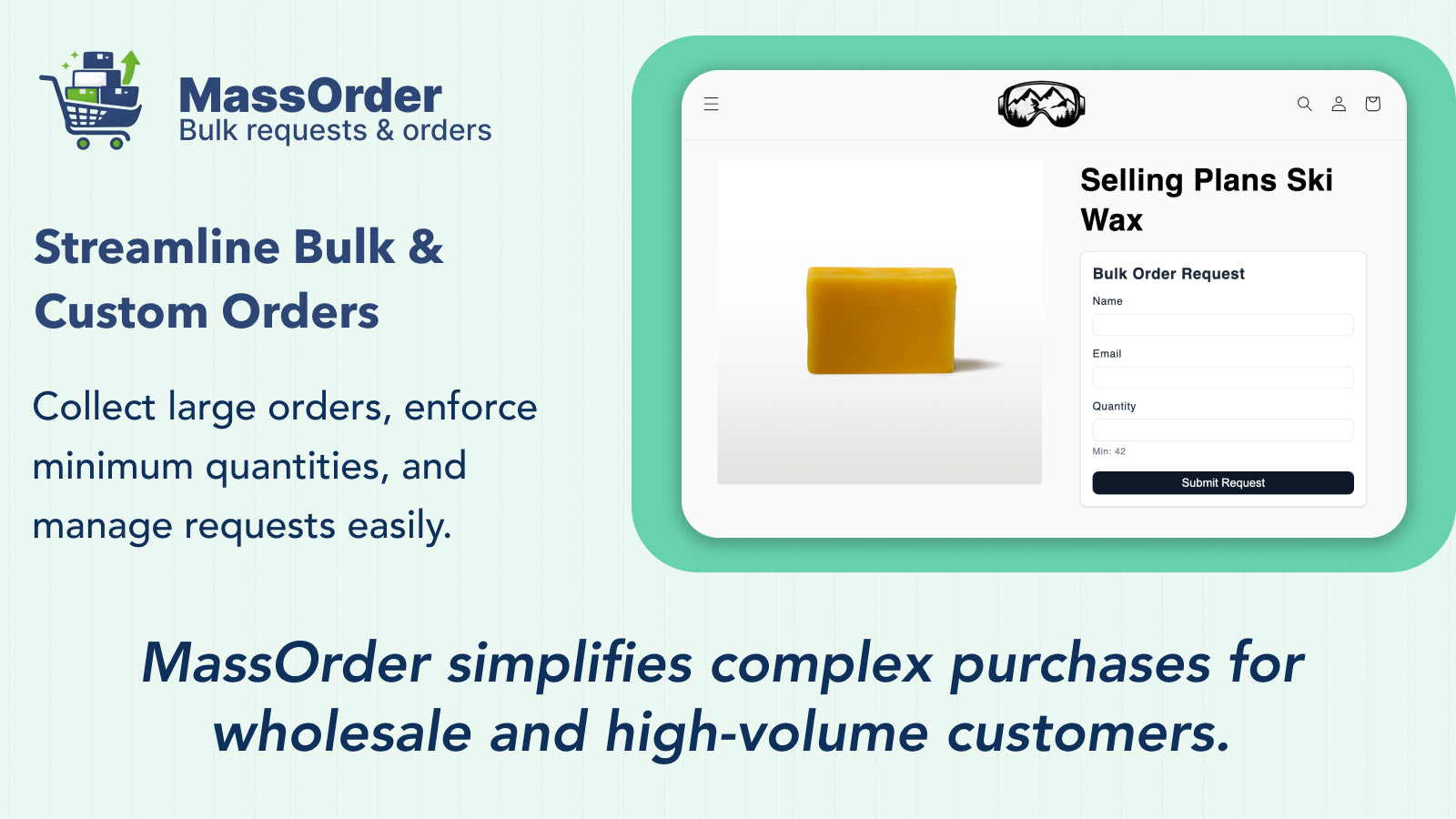 MassOrder lets customers place bulk orders or requests with notes; merchants get alerts.