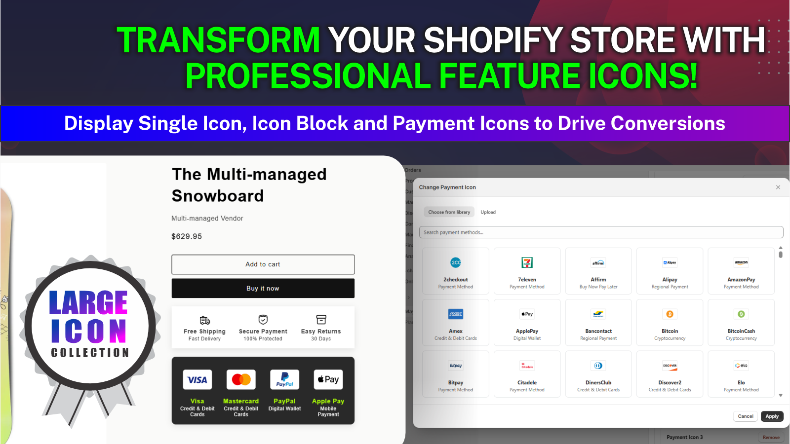 Mayyos Trust Badges & Icons helps merchants build buyer confidence by displaying trust badges, payment icons, guarantees, and product labels across their store. It provides a ready-to-use icon library, full design customization, and flexible placement options. Merchants can upload custom icons to match their branding and ensure badges display consistently on both desktop and mobile devices.