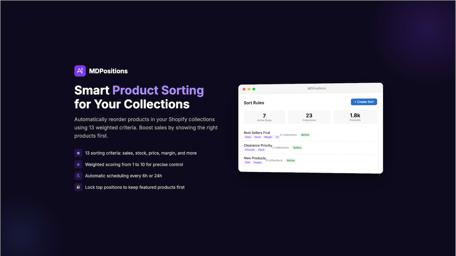 MDPositions réorganise automatiquement les produits de vos collections Shopify selon des règles de tri combinant jusqu'à 13 critères : prix, stock, ventes récentes, date de création, marge, promotions, et plus encore. Chaque critère est pondéré de 1 à 10 pour un contrôle précis. Créez plusieurs règles de tri, assignez-les à une ou plusieurs collections et planifiez leur exécution automatique. Les positions verrouillées permettent de garder certains produits en tête. Idéal pour le merchandising.